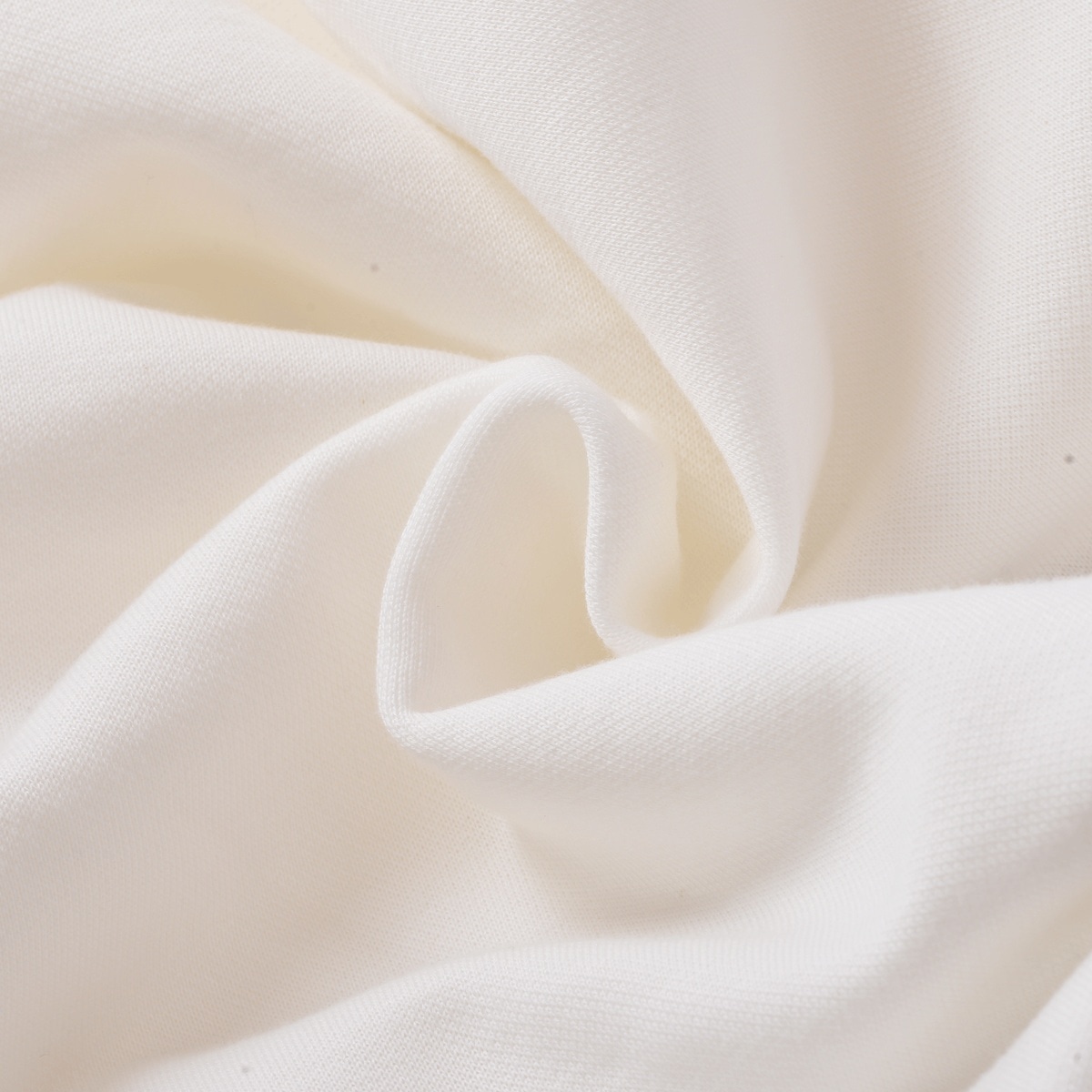 超長綿スーピマコットンに特殊加工を施すことにより、落ち着きのある光沢感とハリ感を実現。今までの裏毛では難しかった薄さと度詰め感の新感覚の素材です。