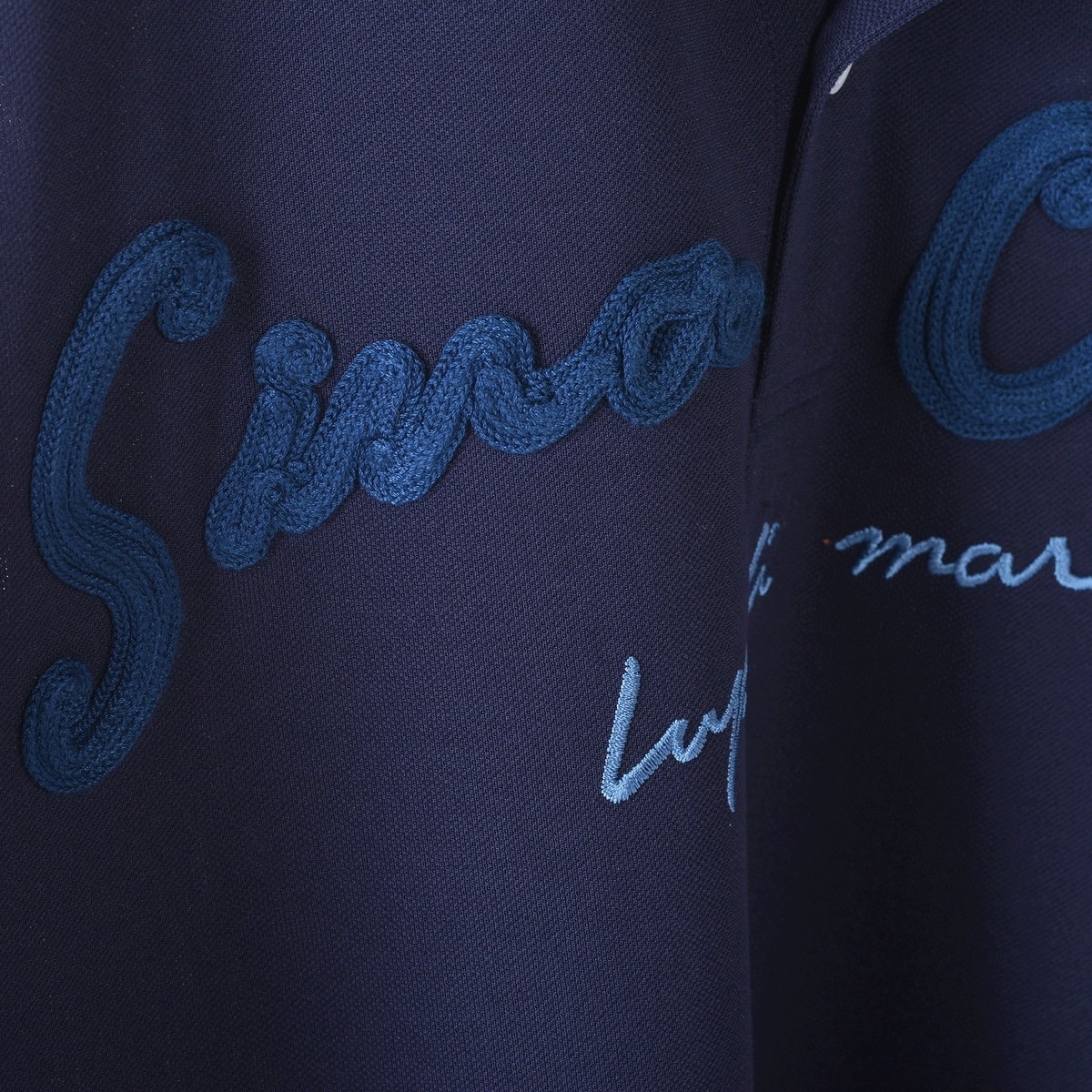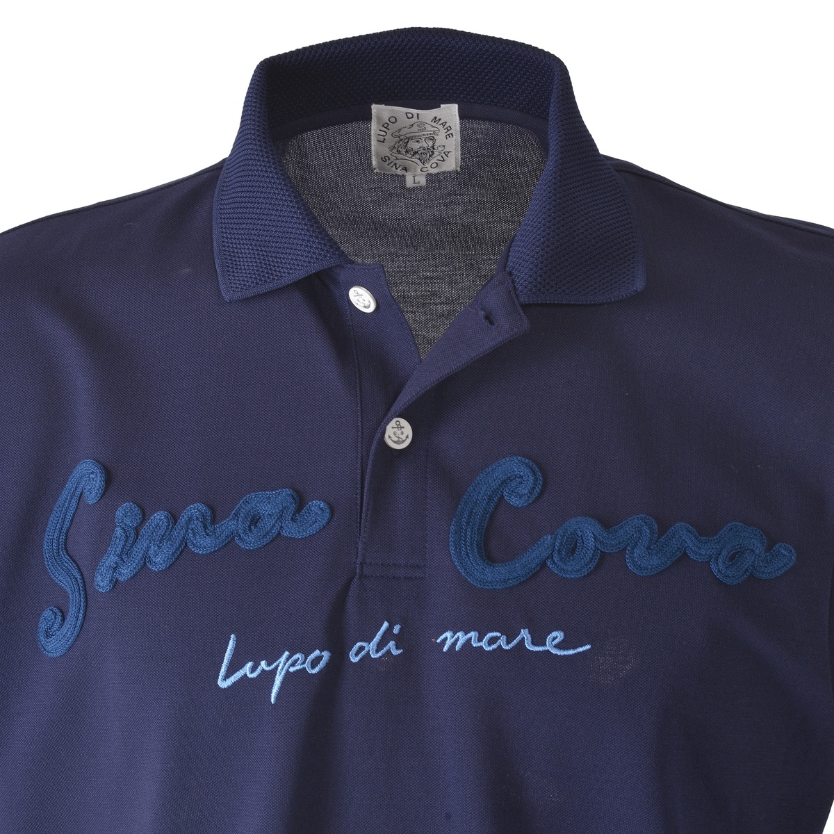 衿に「SINA COVA」ロゴをジャガードでデザインし胸元と袖にワンポイントワッペンモチーフを付けた半袖ポロシャツです。