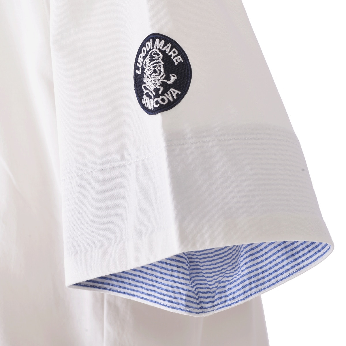 ネック部分はライン入りのニット編みにし袖口を折り返すとボーダー柄が覗くデザインTシャツです。