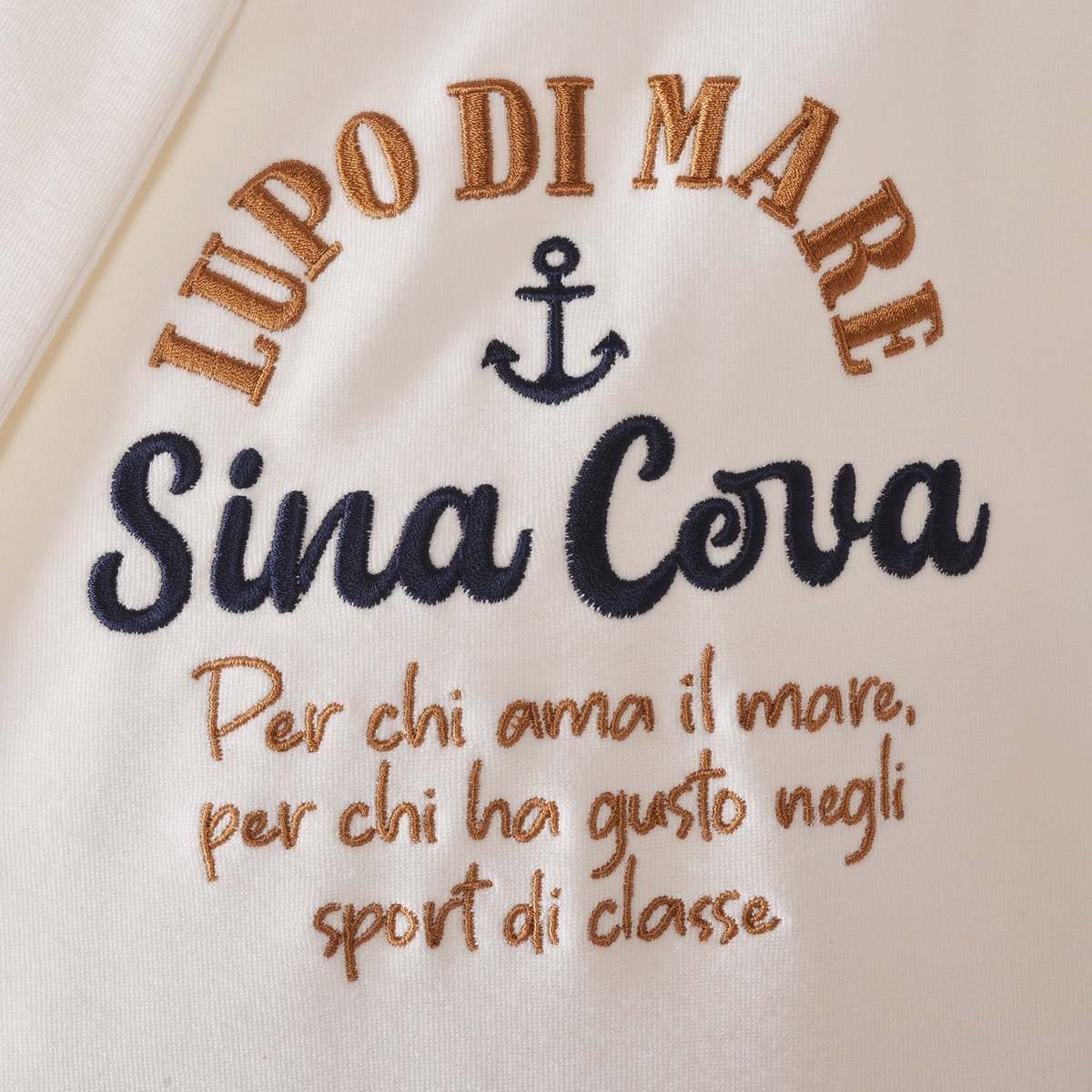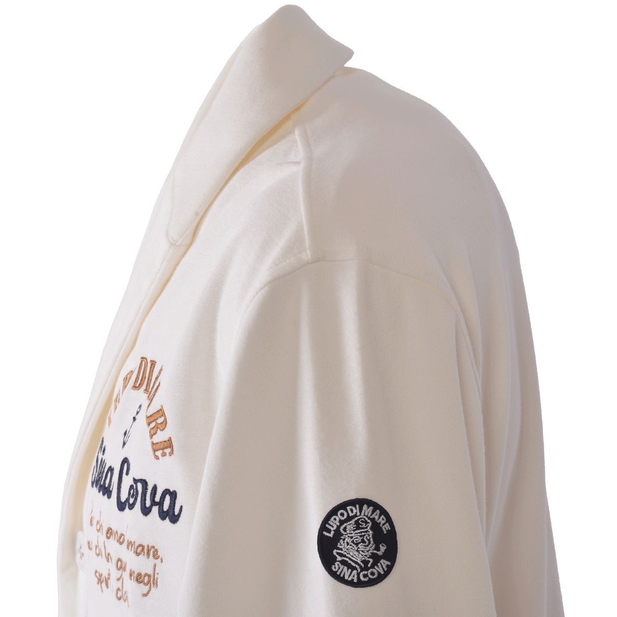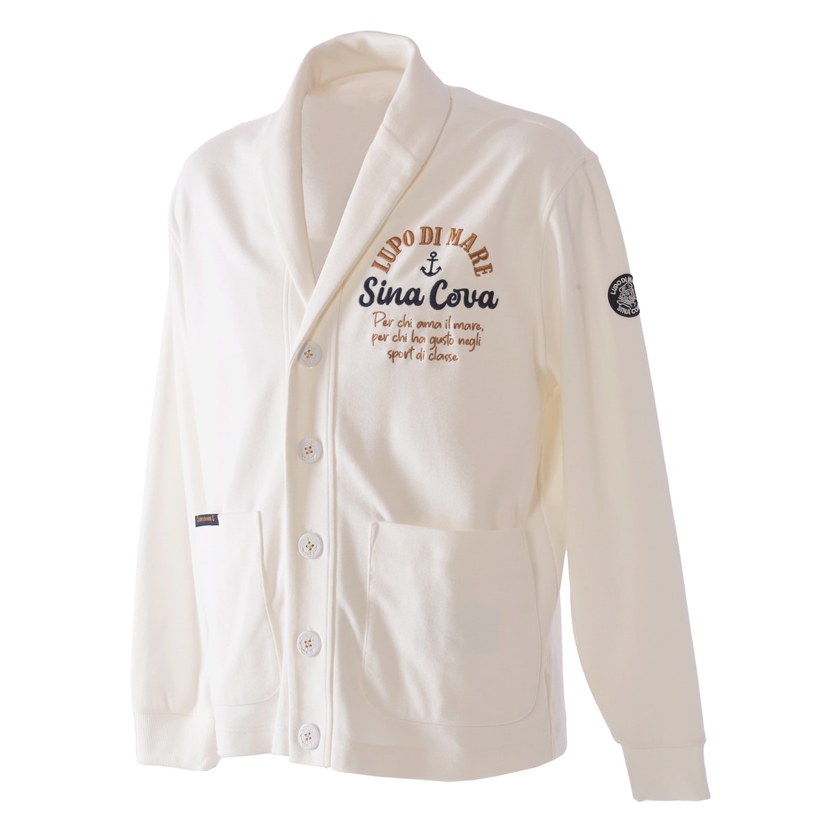 左胸にレターモチーフの「SINA COVA」文字刺繍をデザインしたショールカラージャケットです。