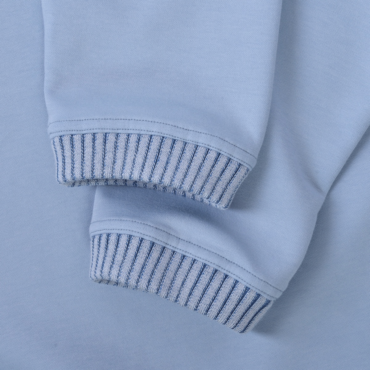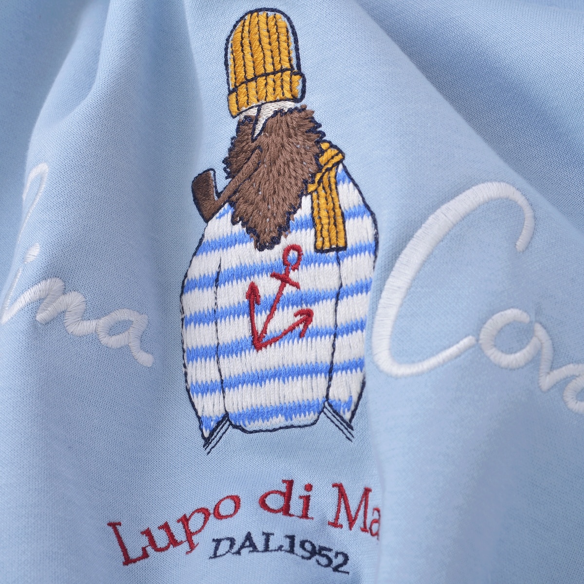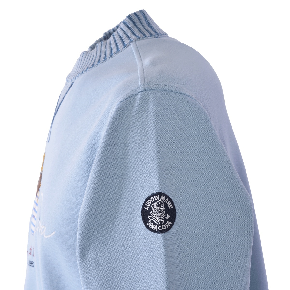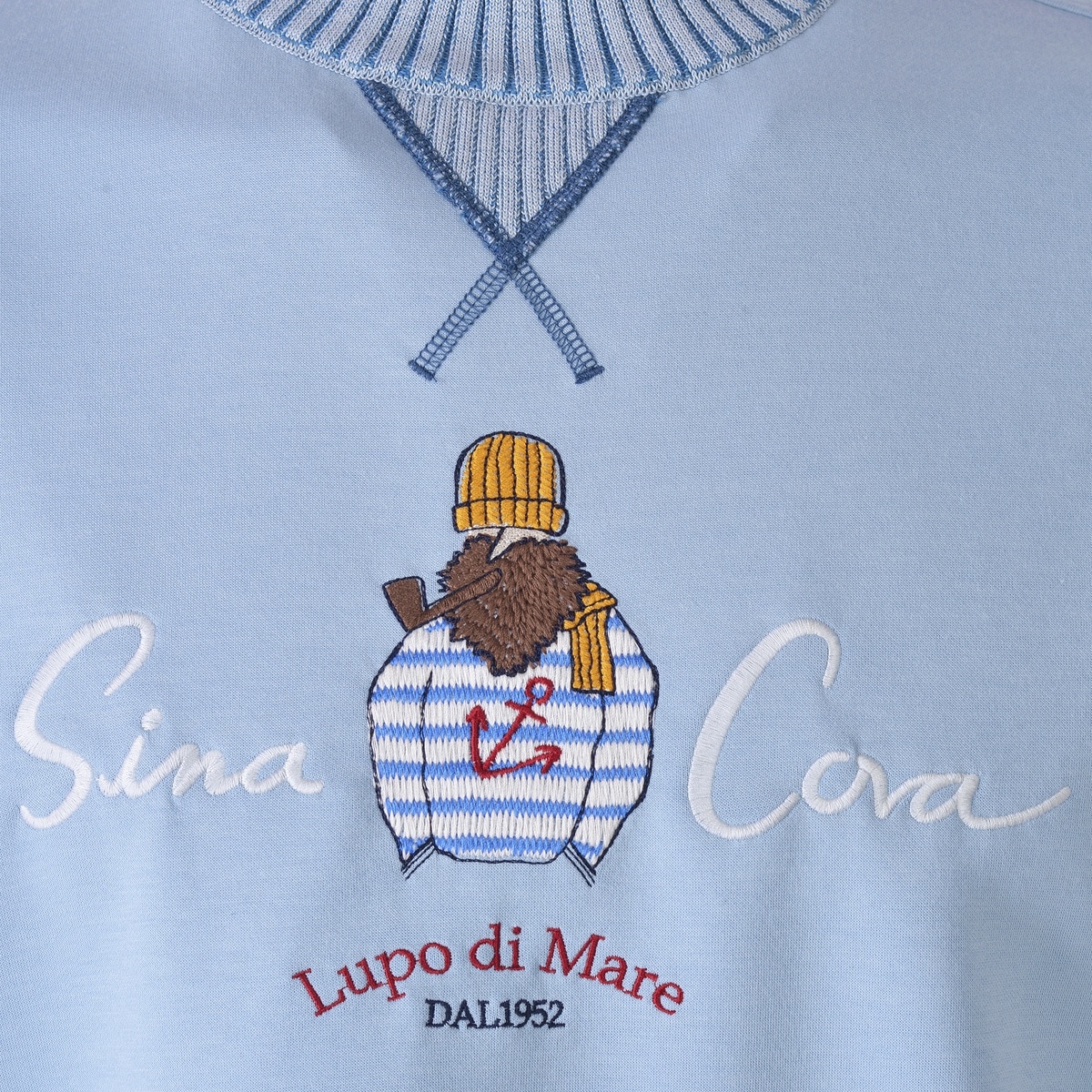 種の選定、栽培、糸の生産に至るまでの基準を吟味したオーガニックコットンとリサイクルポリエステルを使用したこだわりの素材。軽く、適度な張りもあり、風合いも優しい素材です。衿とガゼット部分には、デニムライクな2重臼に配色したニットリブを使用し、衿はリンキングしているため縫い代のごろつきがありません。フロントの船長のモチーフは、手刺しタッチであたたかみを感じるザクザクした感じの刺繍を施しており、1枚でも着映えのする商品です。