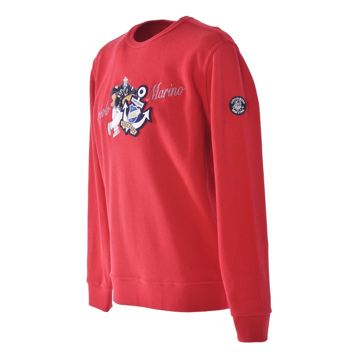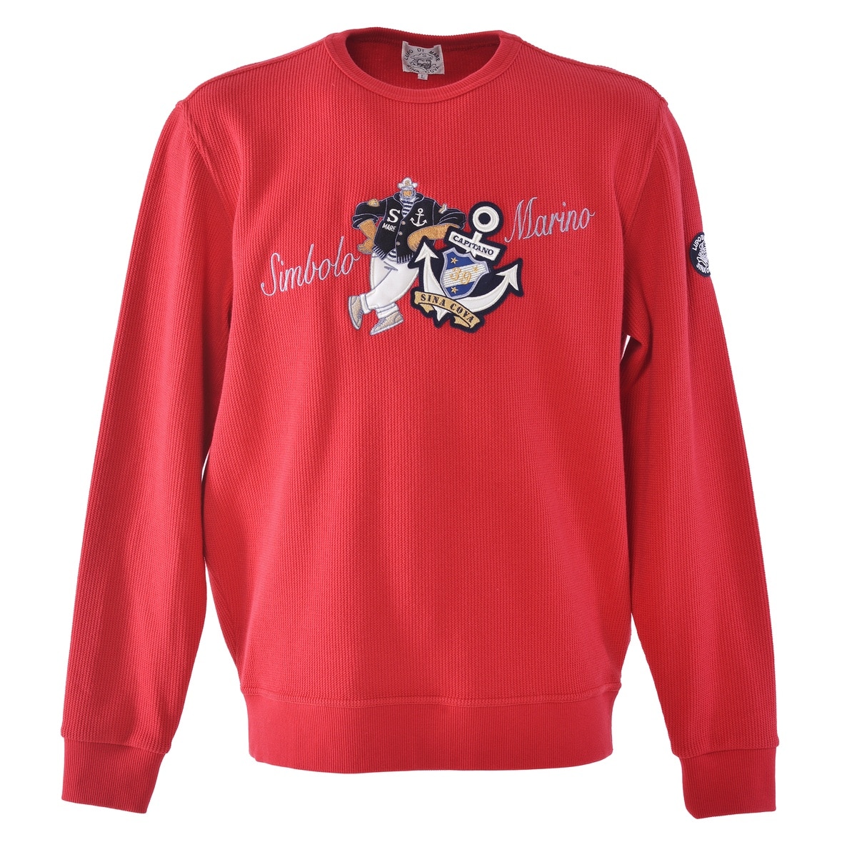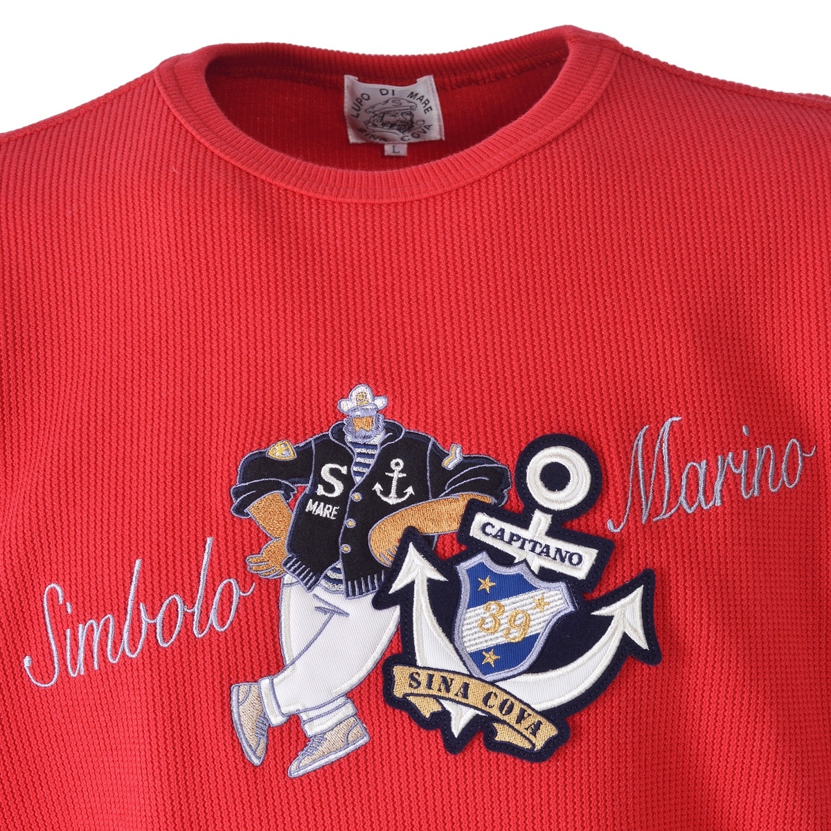表20/2裏30/2の糸を使用して生地の安定感をキープし、表をジグザグの針抜き風に編み、裏側をバーズアイ調に編む事で、しっかりとしたボリューム感を持たせながら、セーターライクのゆとりある軽さを持つ生地感に仕上がっており、目新しい表面効果も見られる素材です。丸首のプルオーバーのトレーナーですが、衿廻りはパイピングのような仕様にしており、フロントにはシナコバらしい凝った作りのアップリケとワッペンを組み合わせた刺繍を施しました。