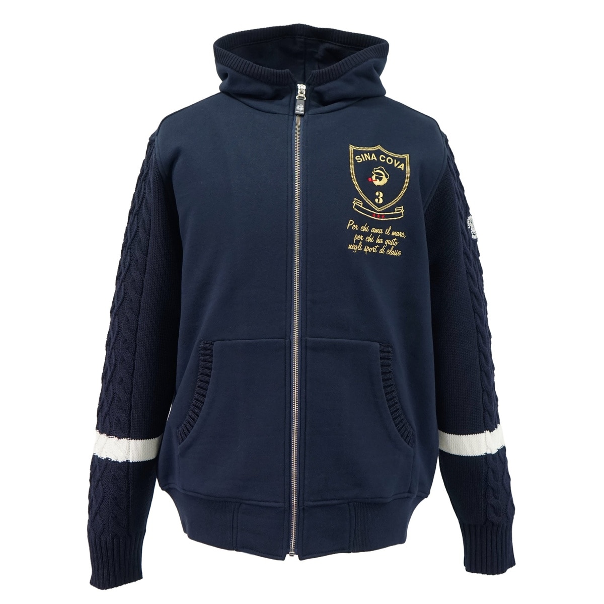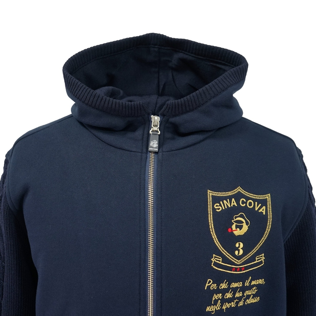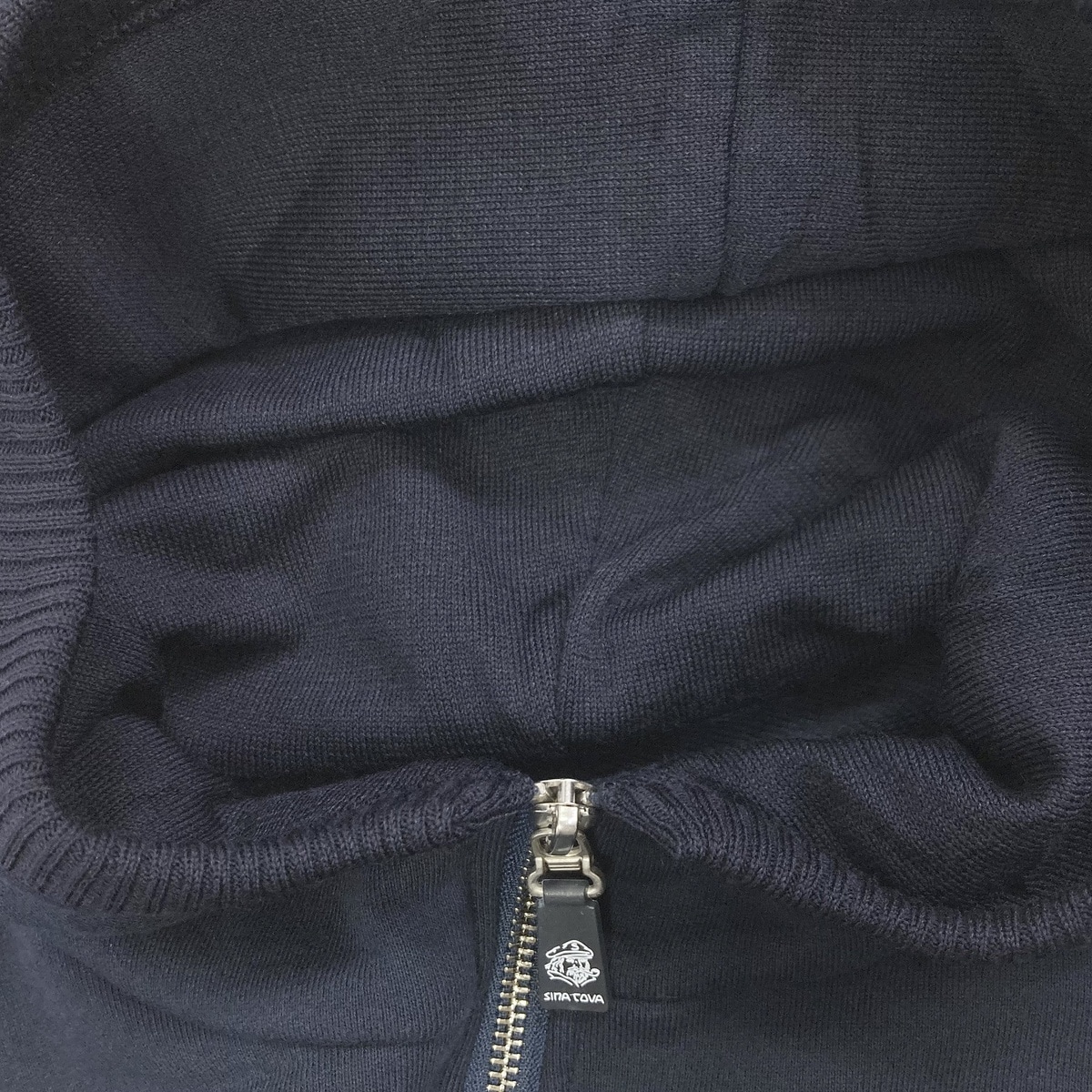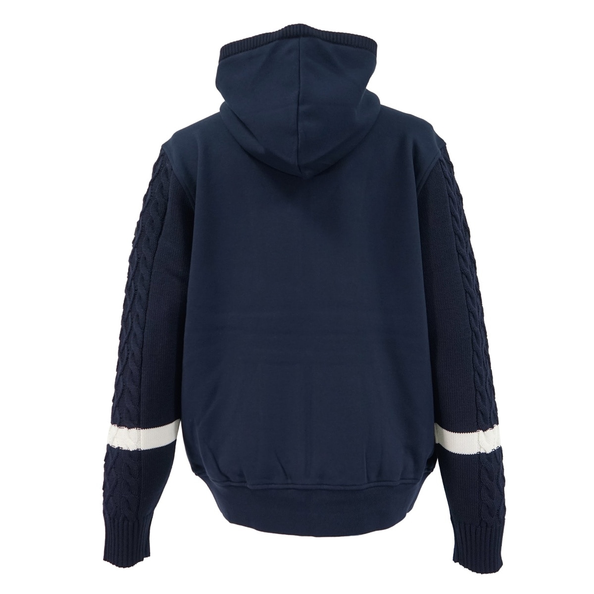 定番的な裏毛を立体感のある素材にするため、表糸と中糸のバランスを調整する事で最大限に度目を詰めてクリアーな表面感にこだわっています。裏糸には双糸を配し立体感のあるループがより膨らみを引き出しています。また、染色処理工程でも高温スチーム機で蒸しながらセットを通し、BRING OUT加工により環境にも配慮した素材です。ニット部分はポリエステルと防縮ウール混で、サラッとした肌触りとエアリーで軽く感じるのが特徴です。フードと袖をニットで、身頃をカットソーでデザインしたパーカーです。左胸には、刺繍を施しています。