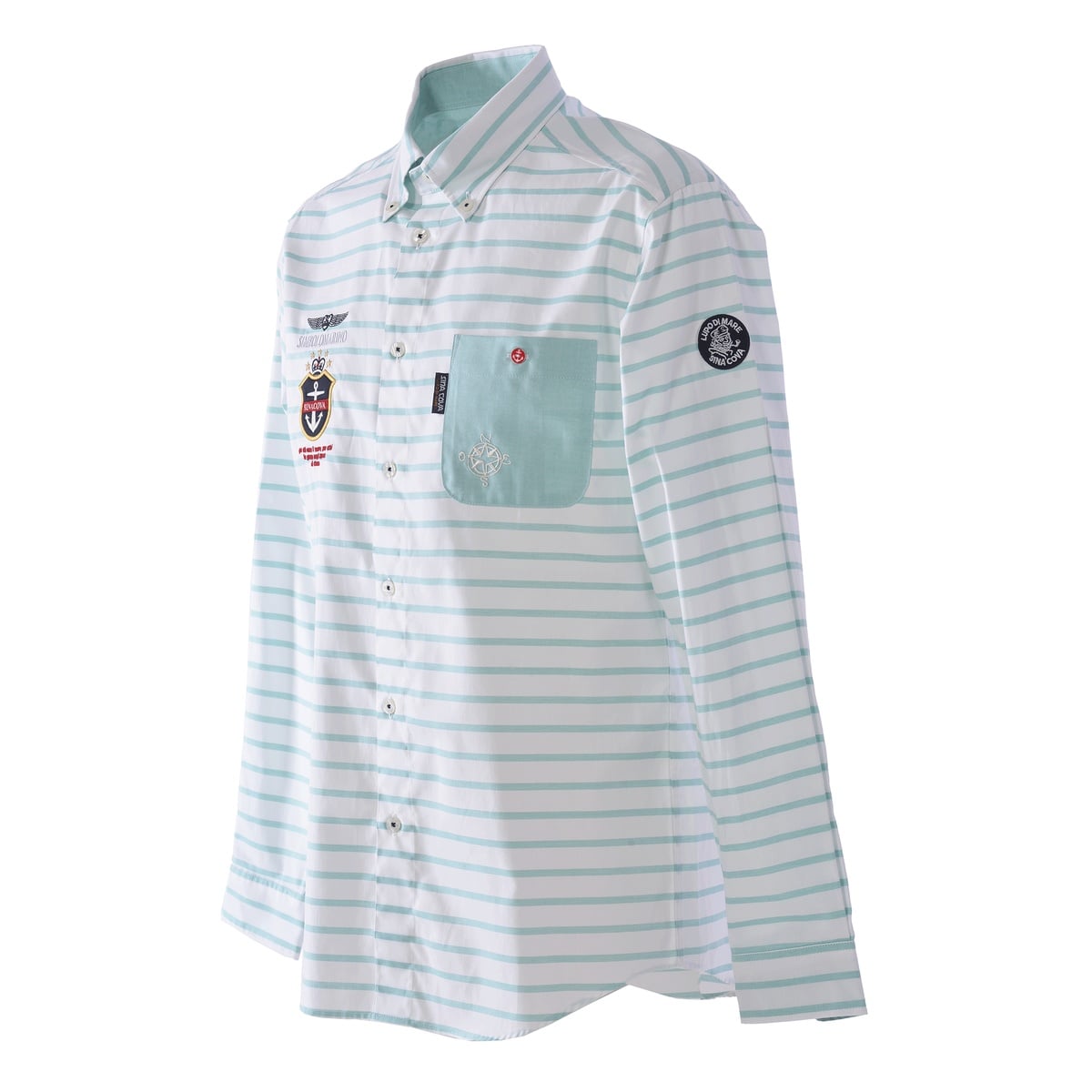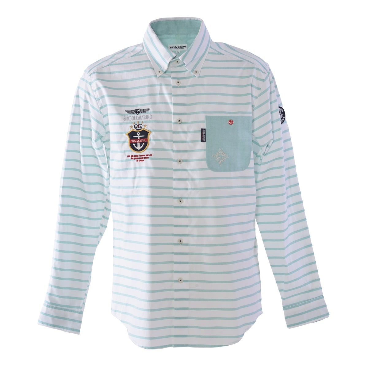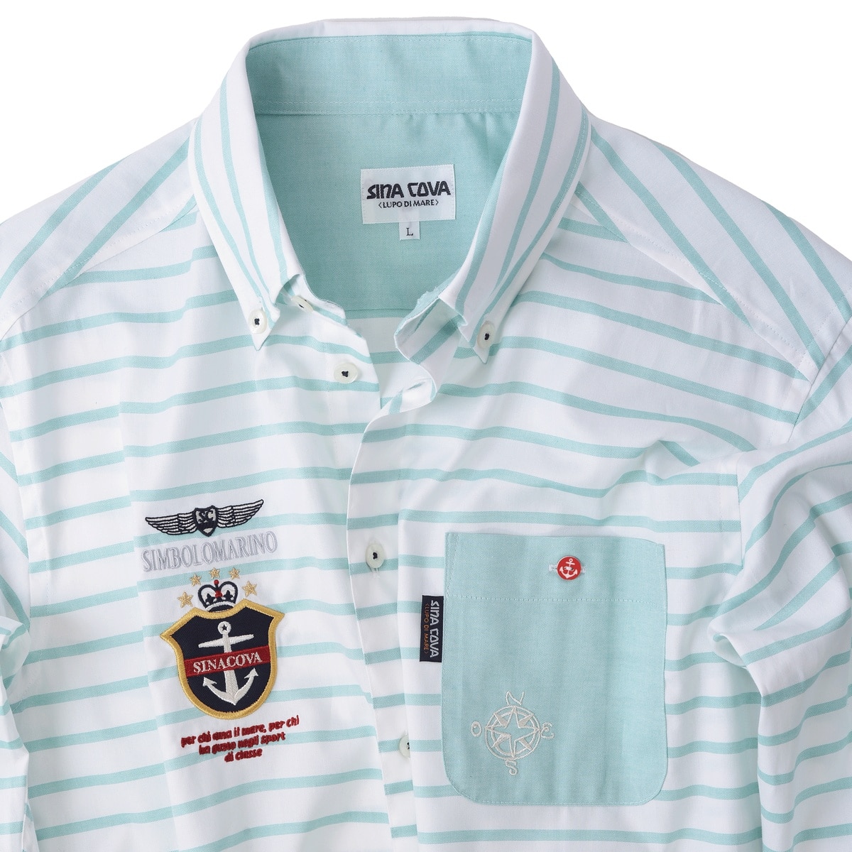 フロントにエンブレム刺繍を施し、ポケットに無地生地をデザインしたボーダー柄長袖ボタンダウンシャツです。縦横ともに80/2双糸で織り上げたオックスフォード生地を使用し、肌触りが良く軽やかな着心地が特徴です。マリンらしいボーダー柄が上品なアクセントとなり、後ろの台衿下部分には蛍光色のグログランテープを配してハンガーフックを装飾しました。台衿内側や上衿裏、カフス裏には配色を施し、切替デザインでマリンテイストを表現しています。細部にまでこだわった配色とデザインがシナコバらしい洗練されたカジュアル感を演出し、日常のスタイリングに上品なアクセントを加える一着です。・オールシーズンシャツ・イカリボタン・ボーダー柄シャツ