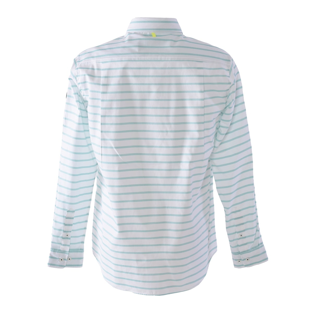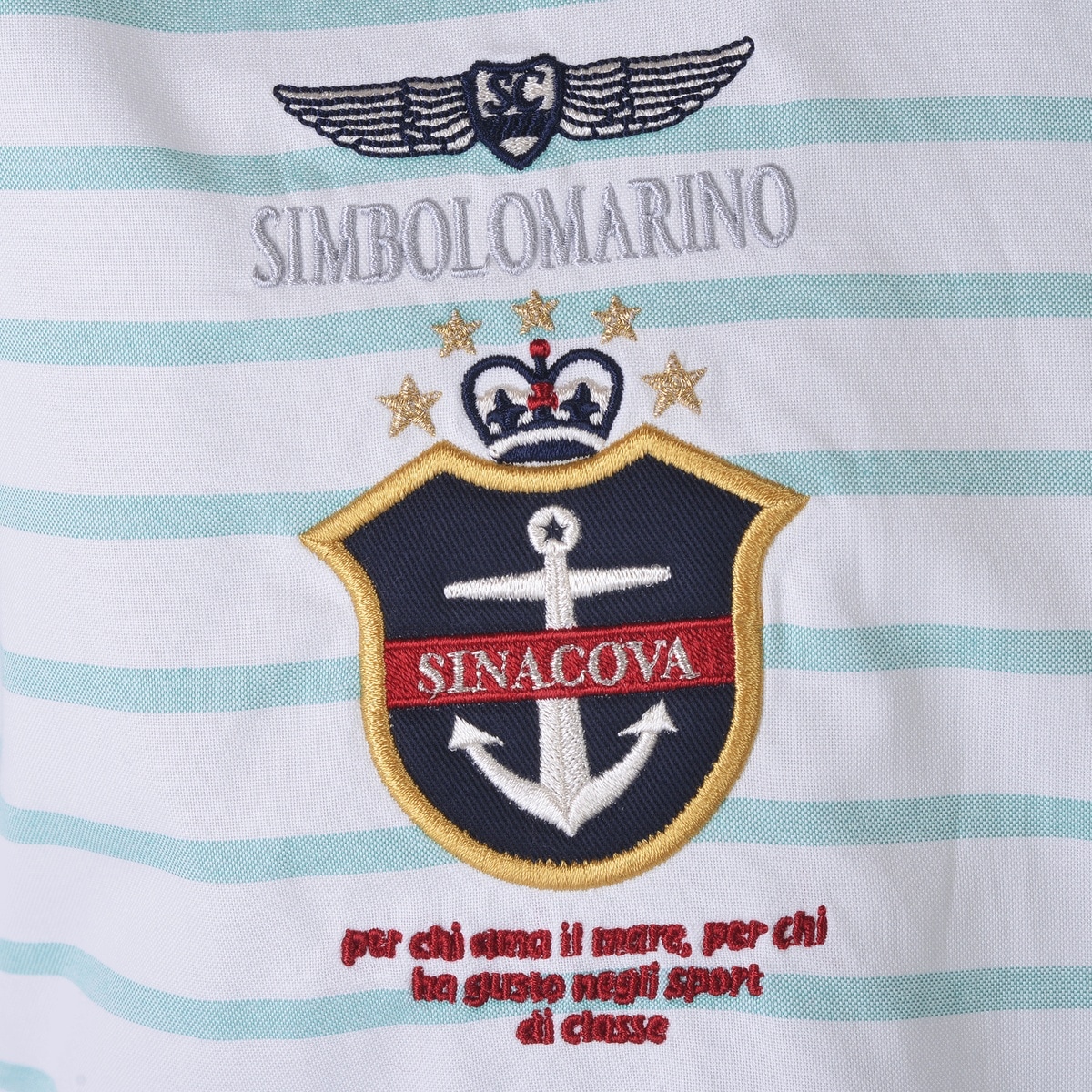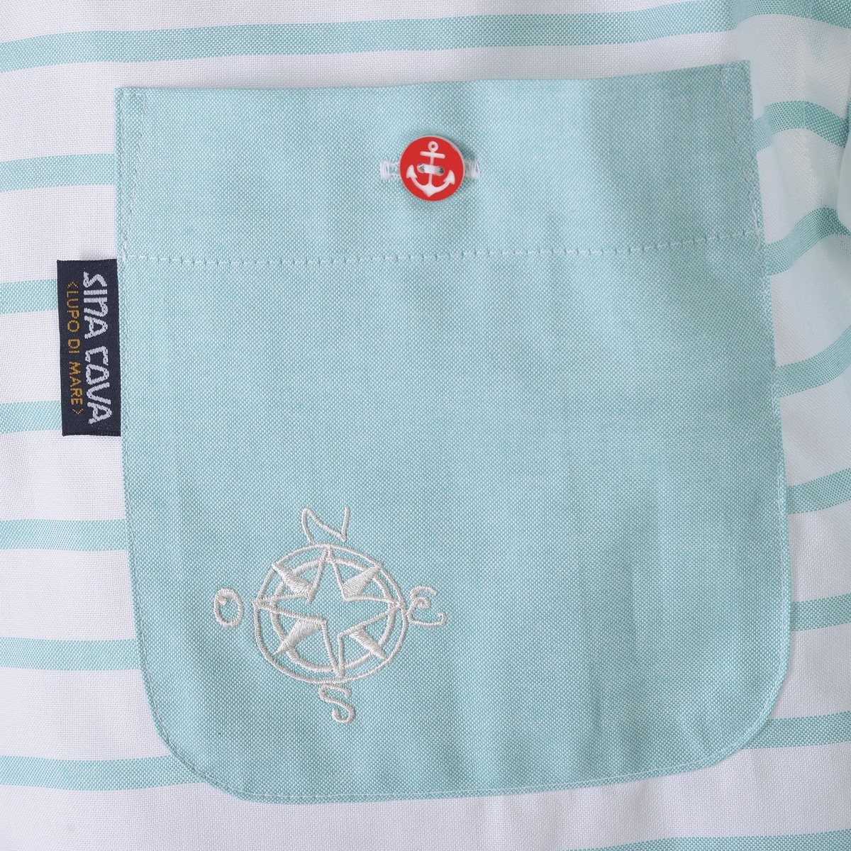 フロントにエンブレム刺繍を施し、ポケットに無地生地をデザインしたボーダー柄長袖ボタンダウンシャツです。縦横ともに80/2双糸で織り上げたオックスフォード生地を使用し、肌触りが良く軽やかな着心地が特徴です。マリンらしいボーダー柄が上品なアクセントとなり、後ろの台衿下部分には蛍光色のグログランテープを配してハンガーフックを装飾しました。台衿内側や上衿裏、カフス裏には配色を施し、切替デザインでマリンテイストを表現しています。細部にまでこだわった配色とデザインがシナコバらしい洗練されたカジュアル感を演出し、日常のスタイリングに上品なアクセントを加える一着です。・オールシーズンシャツ・イカリボタン・ボーダー柄シャツ