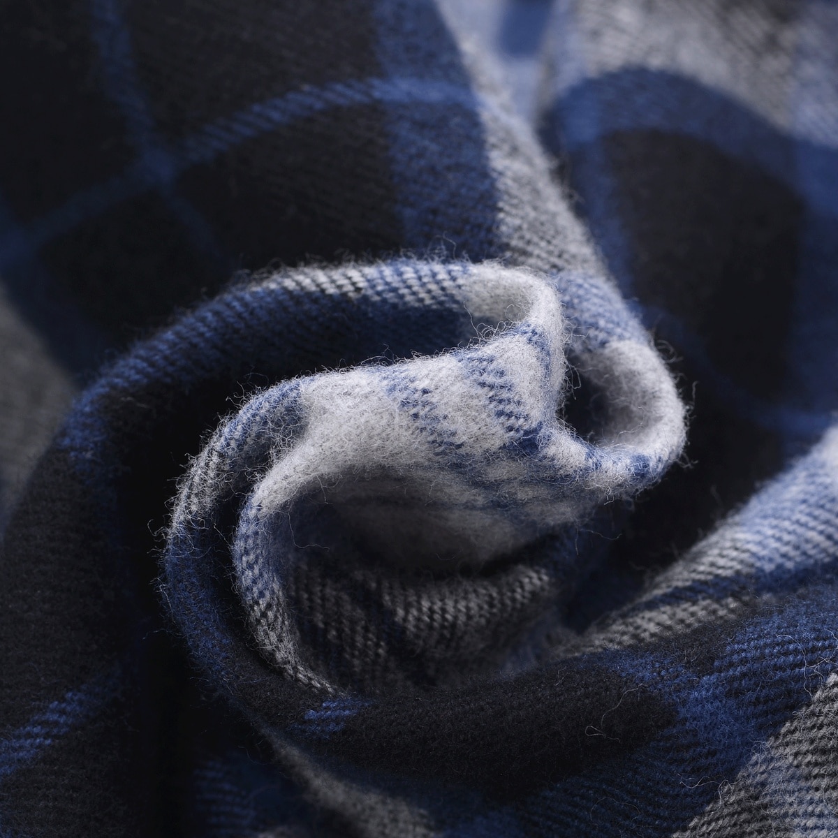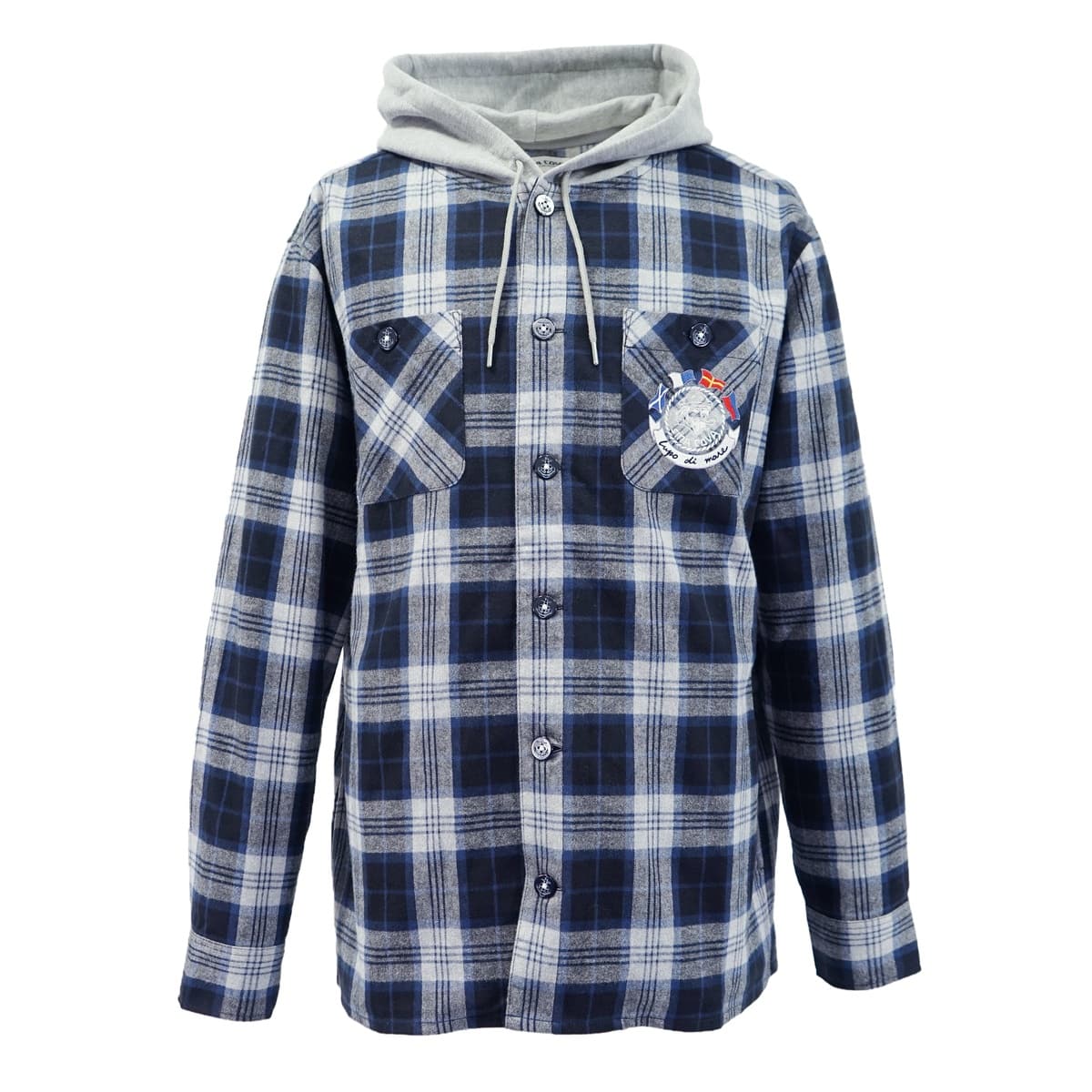 シャツジャケットのタフな印象に立体感を加えるフード付きデザインにしました。シャツの意匠を残しつつ、アウターらしさを強めた一着です。身頃とアームにゆとりを持たせたボックスシルエットにし身頃にはインド産オーガニックコットンを100%に毛足の長いシャギー加工をかけたネル素材を使用しています。フード部分には保温・吸湿性に優れた裏毛素材を採用しフード部分は顔周りに受ける雨風を防ぐだけでなく、裏毛素材を使用することでカジュアル感を抑えてスポーティーな印象も演出しています。左胸ポケットにシンボルマークと信号旗の刺繍をデザイン。フロントサイドにポケット付きです。