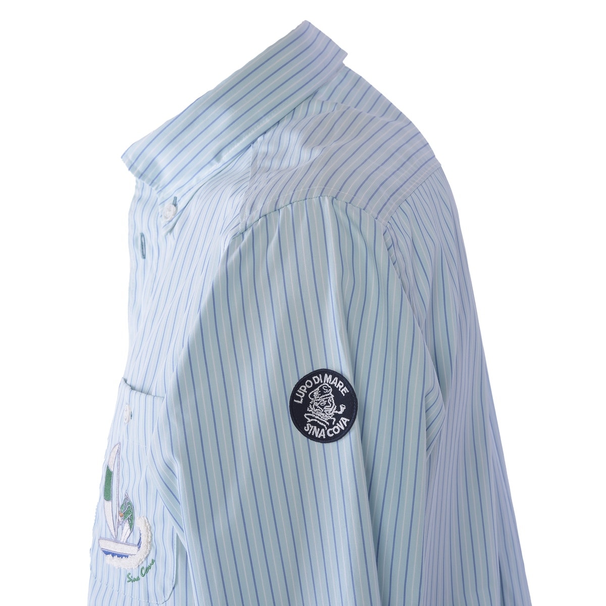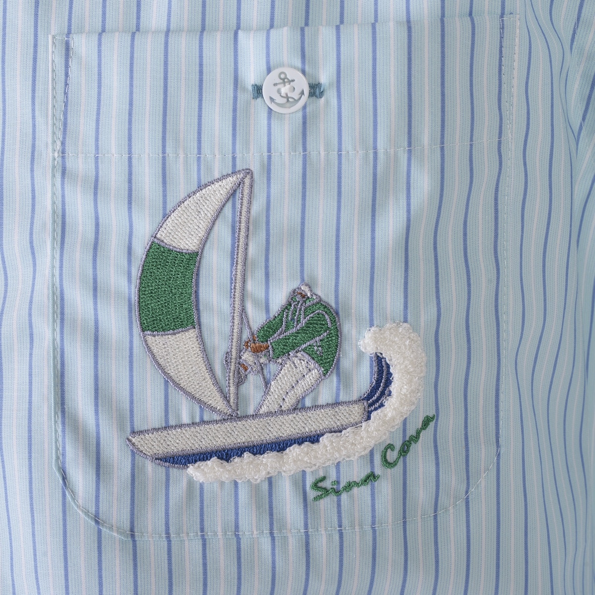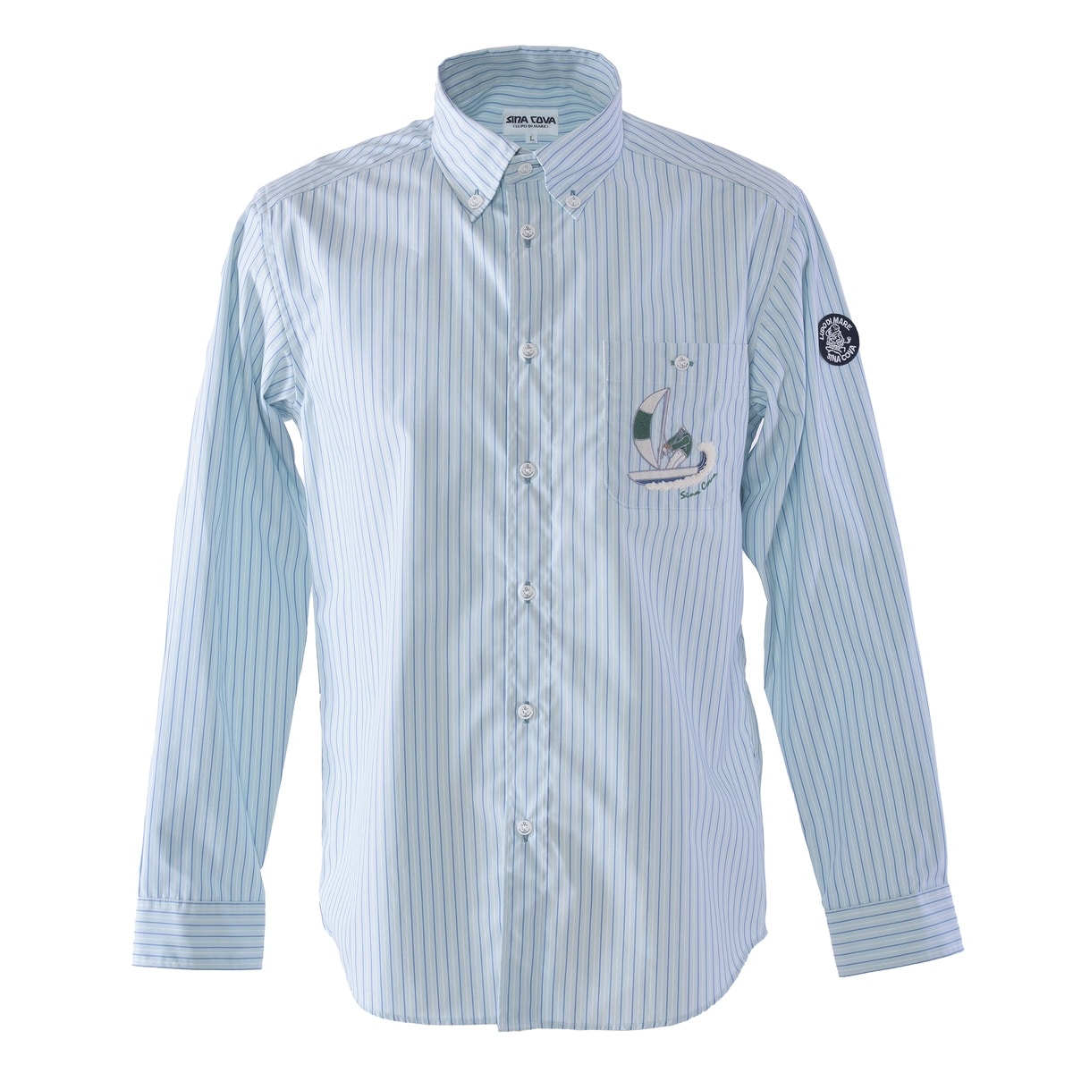 左胸ポケットに立体感のあるキャプテンの刺繍とサガラ刺繍加工の船走波をデザインしたストライプ柄長袖ボタンダウンシャツです。残暑の秋から暖冬まで快適に過ごせるイージーケア性に優れた一着です。ボックスシルエットながらスッキリとした印象に仕上げました。カリフォルニア州産の綿を高密度に織った先染めタイプライター素材で、適度なハリ感と滑らかな風合いが特徴です。綿100%ながらシワになりにくく、綿特有の汗や湿気を吸収し肌をドライに保つ素材特性機能もあり、快適に過ごせます。色によって柄ピッチの異なるストライプ柄をお楽しみください。・イカリボタン・ボタンダウンシャツ・高機能素材
