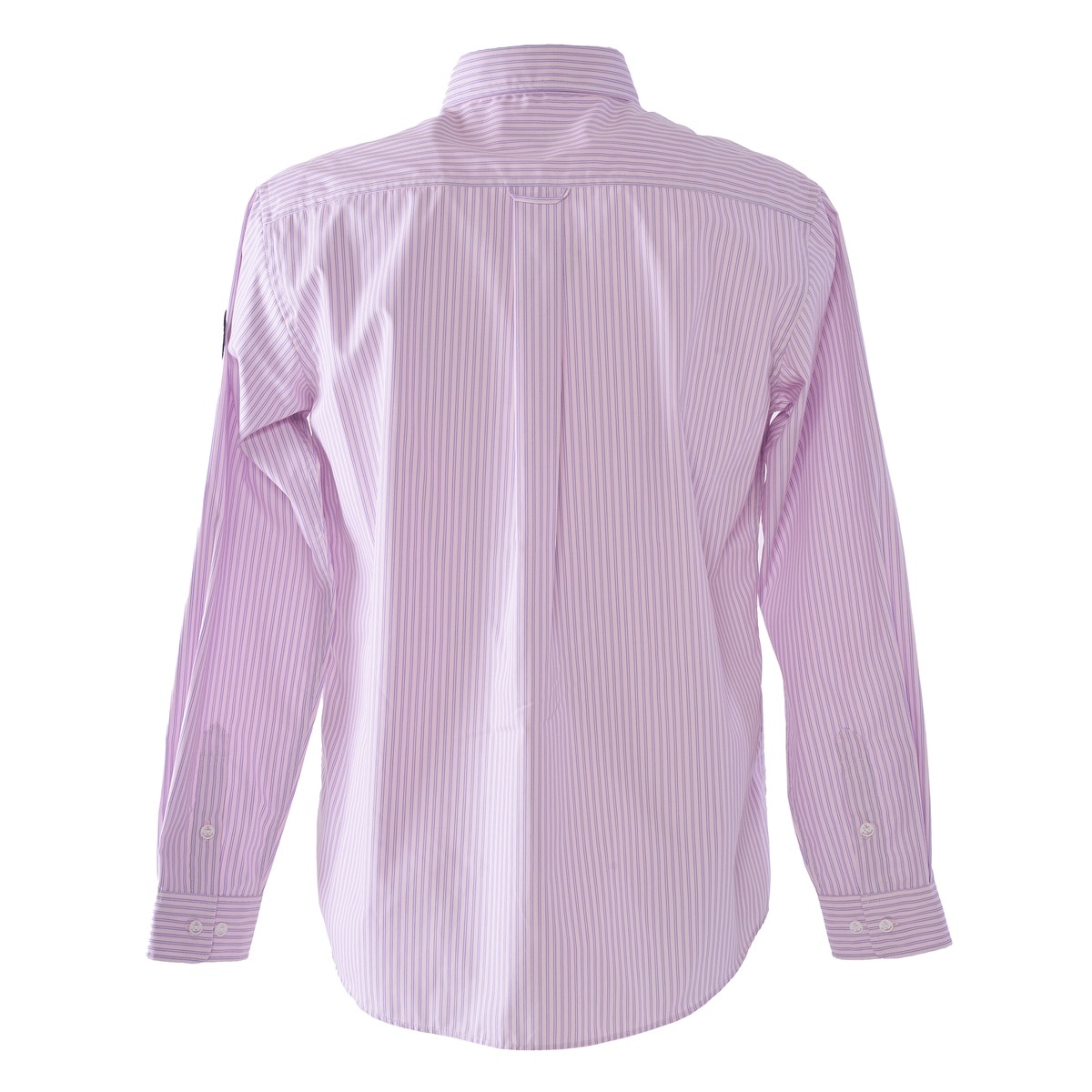 左胸ポケットに立体感のあるキャプテンの刺繍とサガラ刺繍加工の船走波をデザインしたストライプ柄長袖ボタンダウンシャツです。