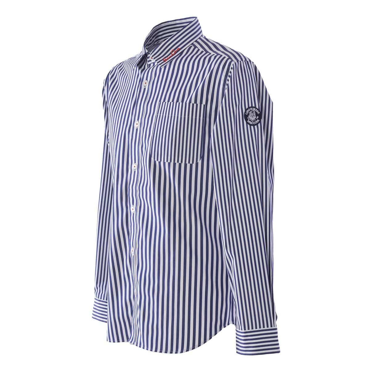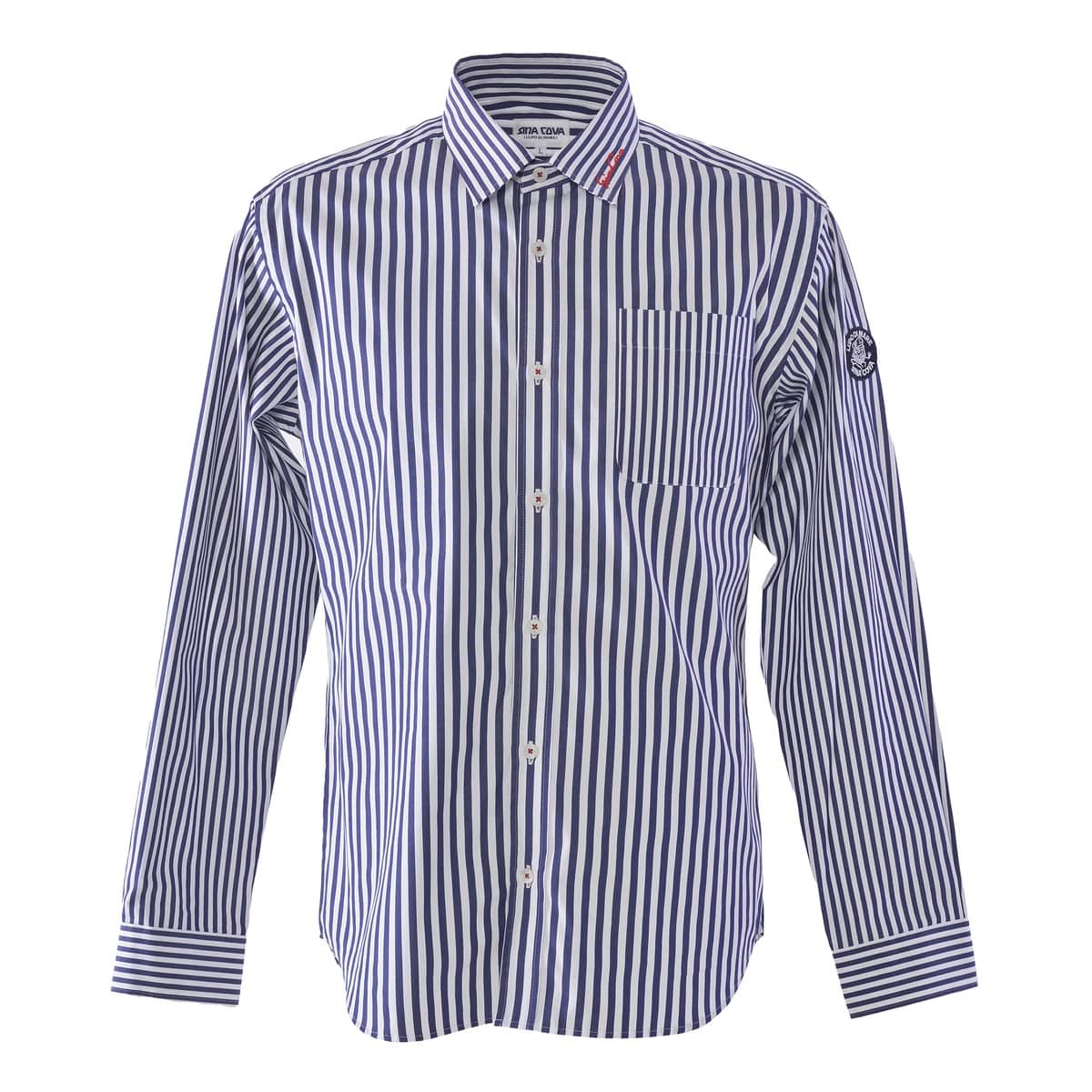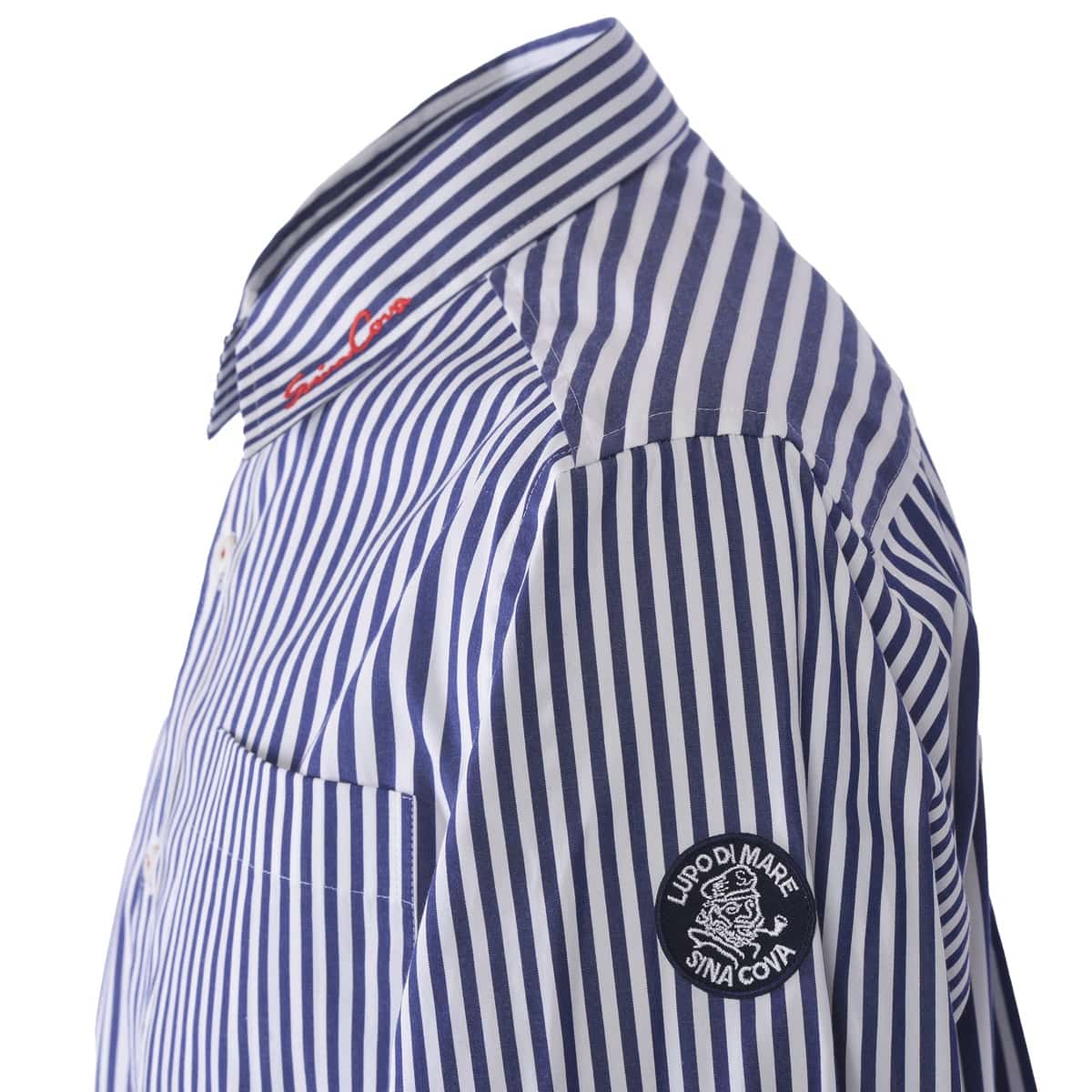 「SINA COVA」文字ロゴ刺繍を襟にデザインしたストライプ柄長袖シャツです。