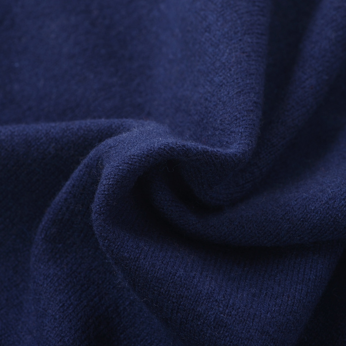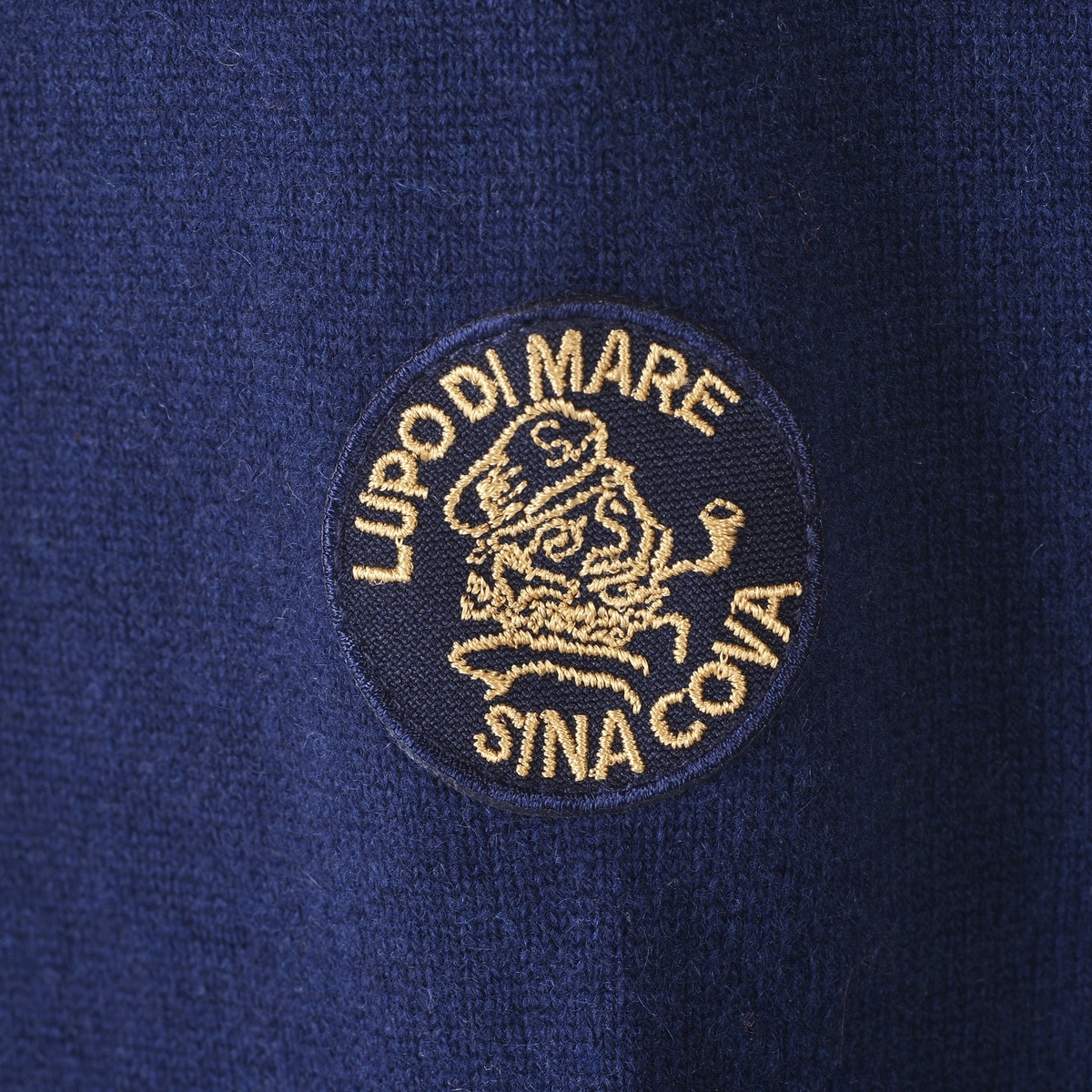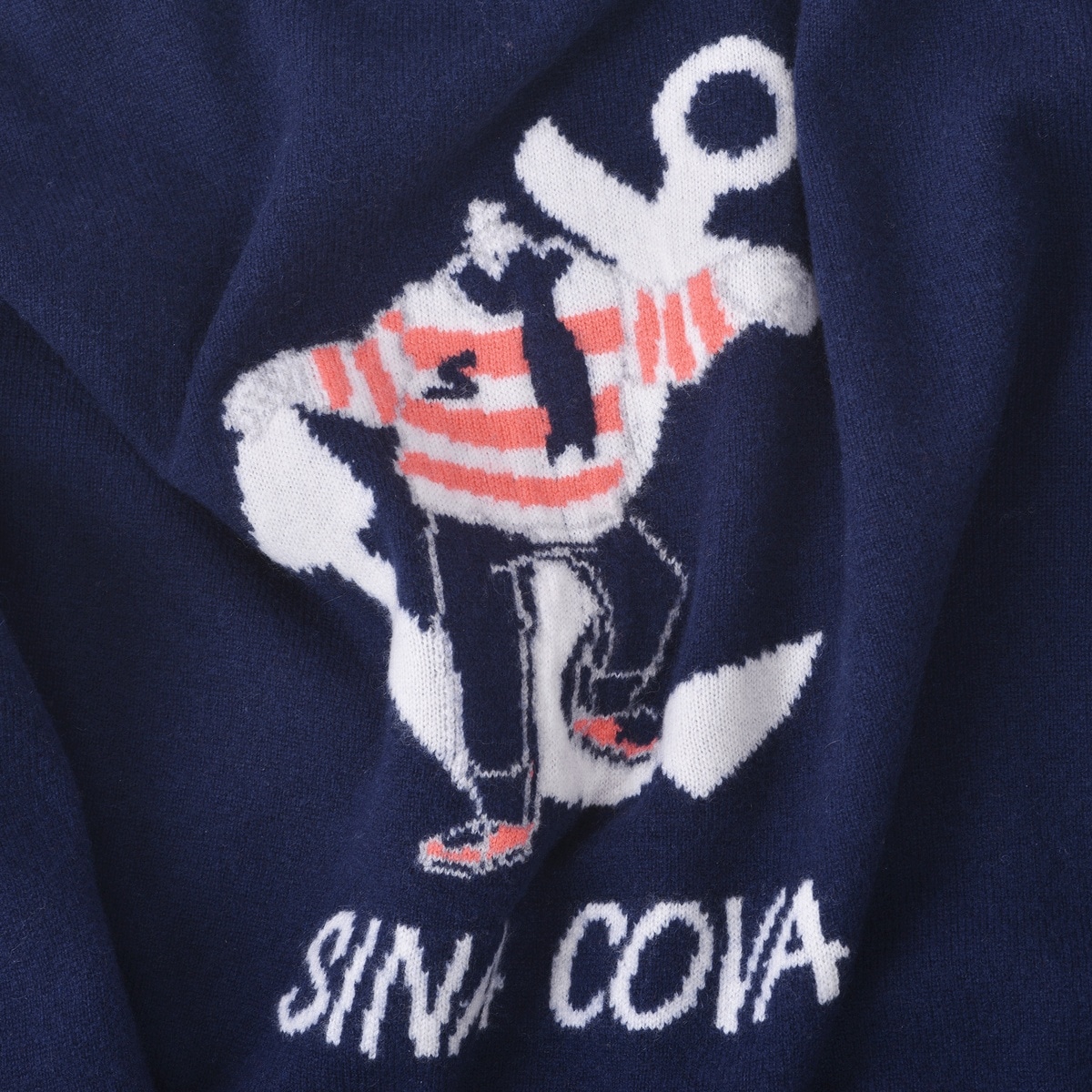 メリノウール原料(17.5MIC)に防縮加工を施したスーパーメリノウールと、柔らかなカシミヤを紡績した糸を使用。バスラン加工(防縮)によりウール特有のチクチク感を抑え、柔らかな肌触りと程よい光沢感を生み出しています。カシミヤは10%ですが、スーパーメリノウールに特殊加工を施した糸のため、風合いを損ないにくく新鮮な色とソフトな手触りがあり、着心地の良さにもこだわった、高級感のあるセーターです。フロントのキャラクターはWジャガードで表現しています。また、衿元の端から内側にかけての配色もシナコバらしい商品です。