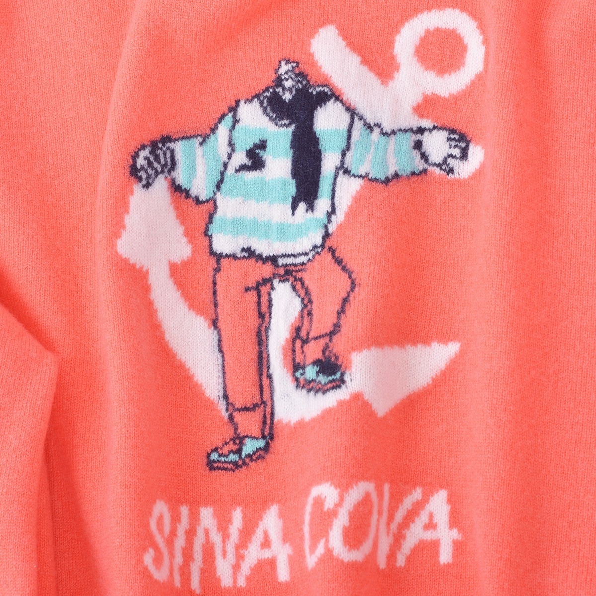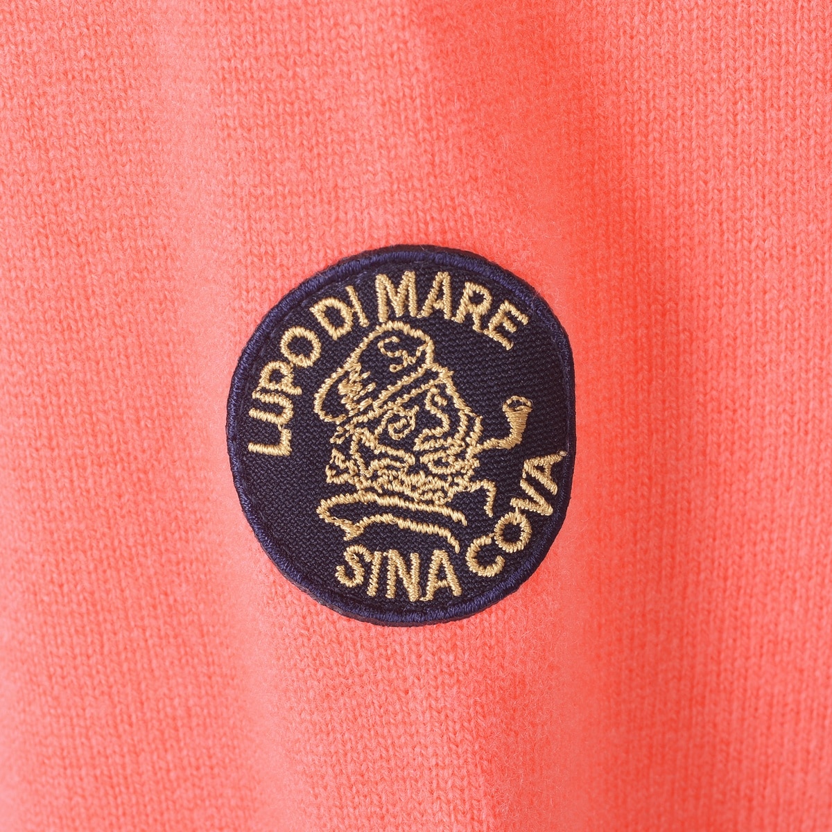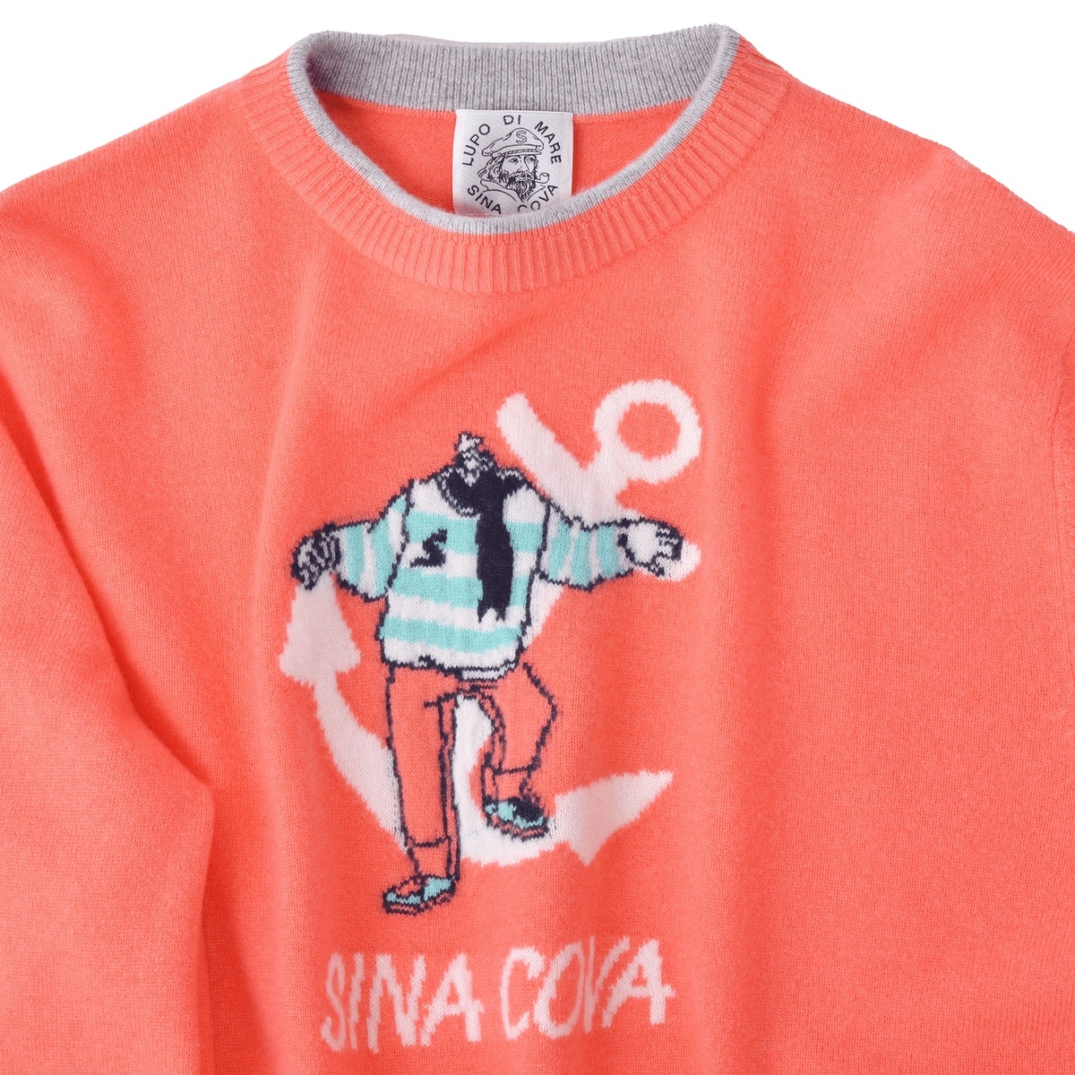 メリノウール原料(17.5MIC)に防縮加工を施したスーパーメリノウールと、柔らかなカシミヤを紡績した糸を使用。バスラン加工(防縮)によりウール特有のチクチク感を抑え、柔らかな肌触りと程よい光沢感を生み出しています。カシミヤは10%ですが、スーパーメリノウールに特殊加工を施した糸のため、風合いを損ないにくく新鮮な色とソフトな手触りがあり、着心地の良さにもこだわった、高級感のあるセーターです。フロントのキャラクターはWジャガードで表現しています。また、衿元の端から内側にかけての配色もシナコバらしい商品です。