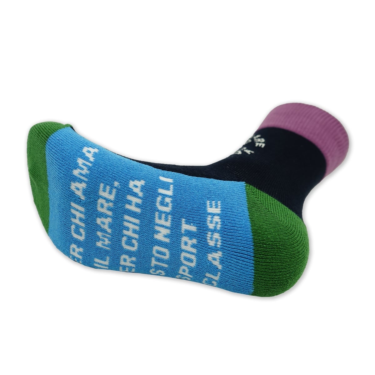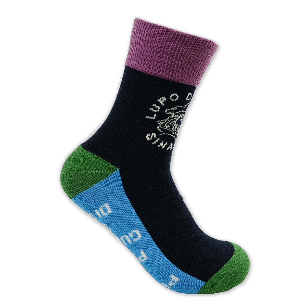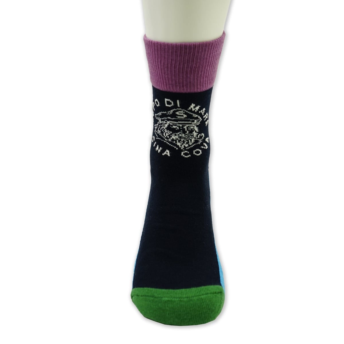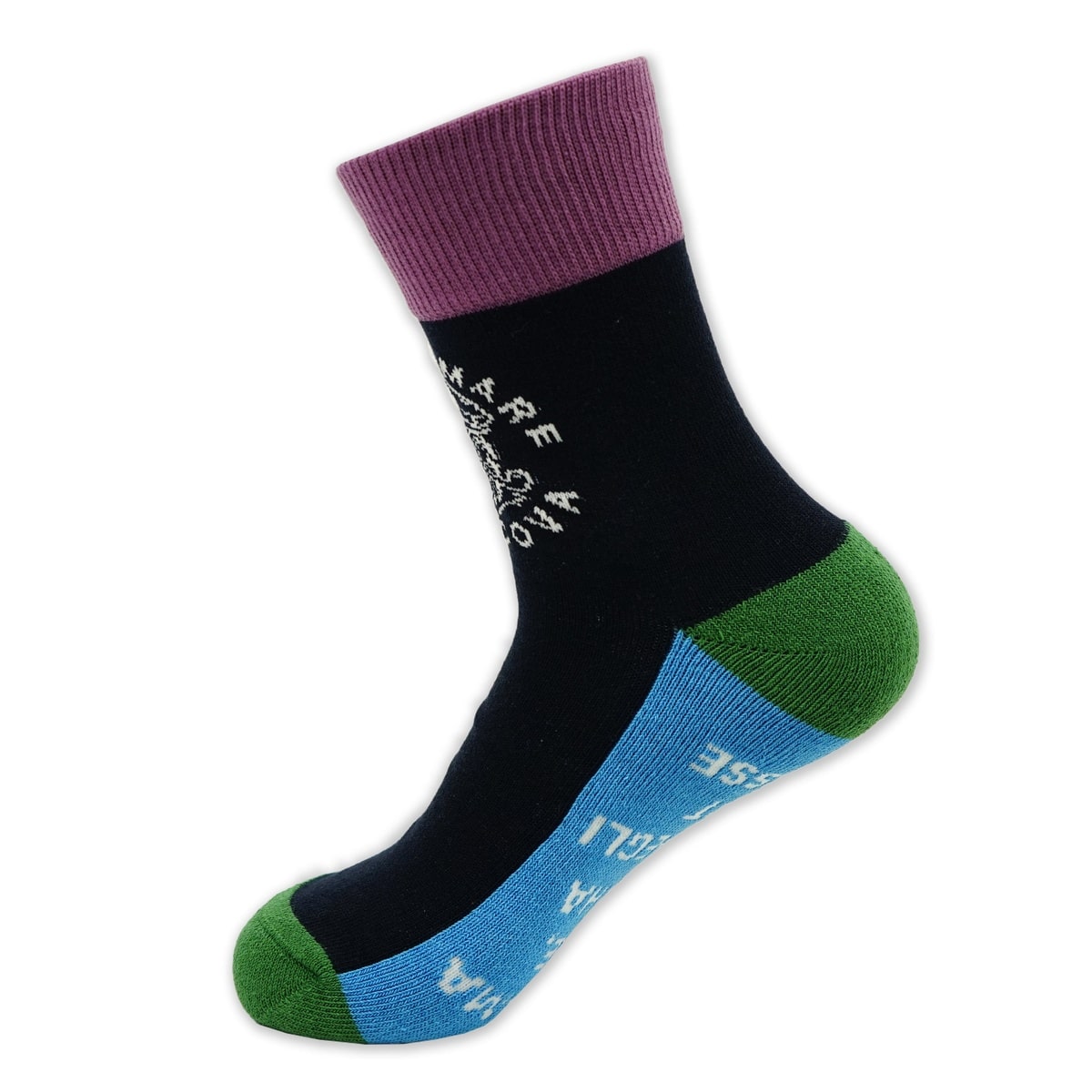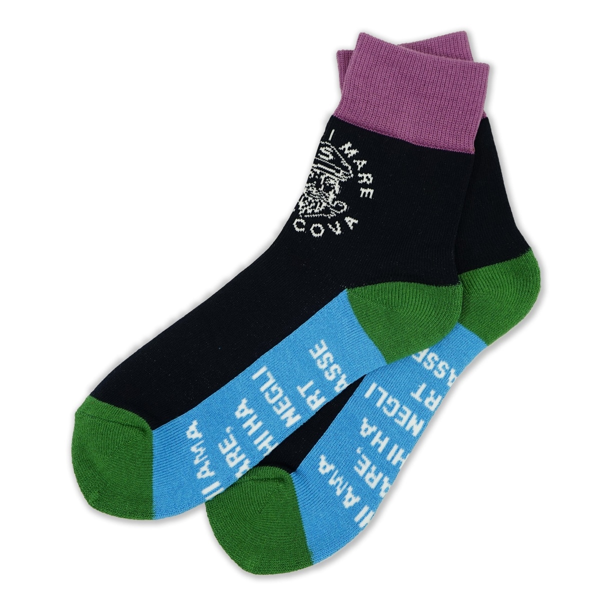 シナコバシンボルロゴと足裏に文字をデザインしたカラーブロック配色のミドルソックスです。ソフトな風合いとしっかりとしたコシのある素材を使用しており、底パイル仕様でクッション性に優れたアイテムです。・底パイルでクッション性抜群・ギフトにもお勧め