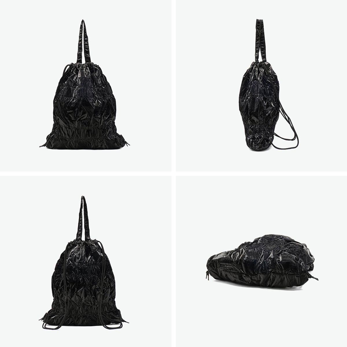 くしゃっとしたギャザーが可愛らしいデザインのナップサック。ハンドル付きなので、背負うのはもちろん手持ちや肩掛けも楽しめます。A4サイズに対応したメインルームはシンプルな作りで、荷物をざっくり収納するのに最適。また、使わないときには折りたためる薄手の素材感も魅力です。