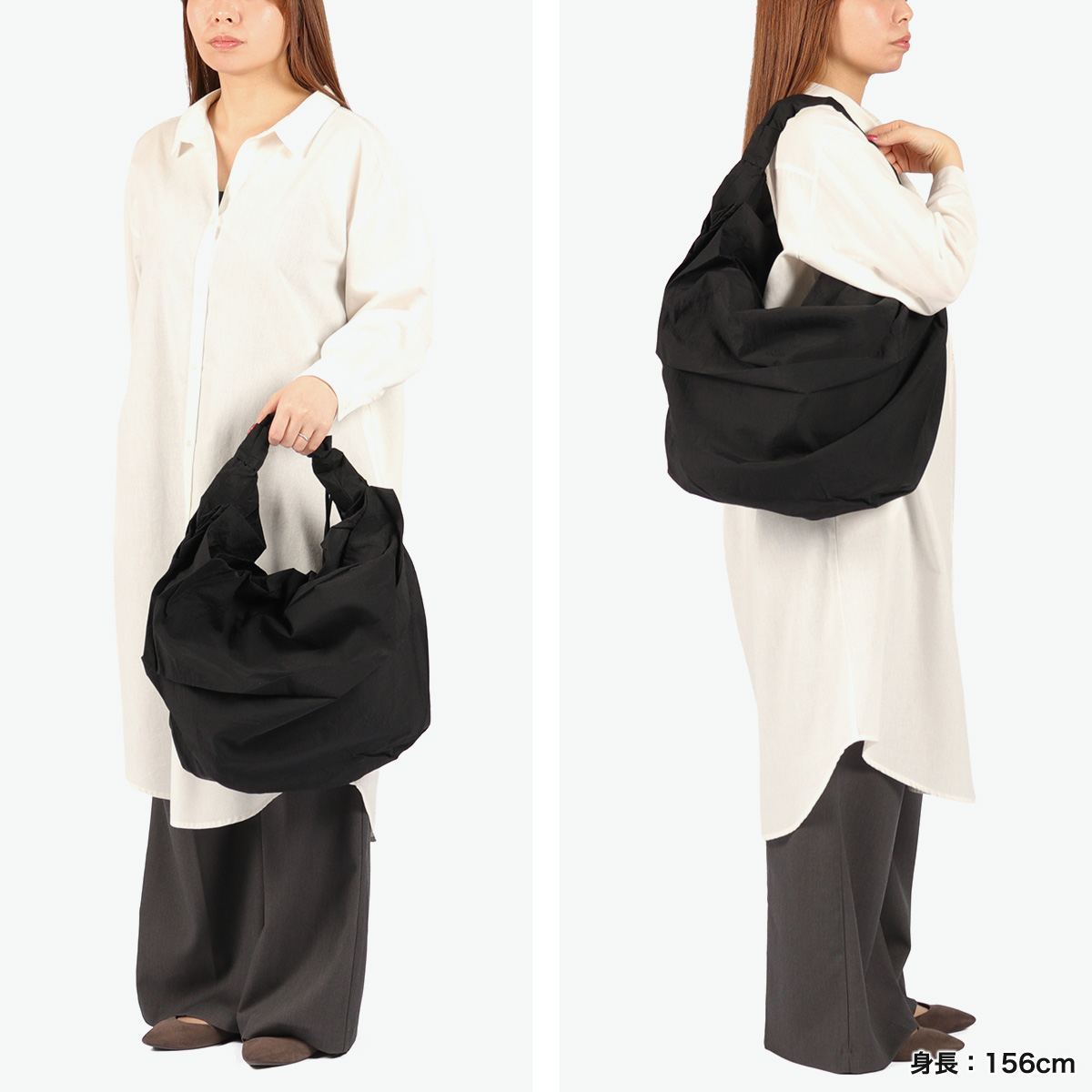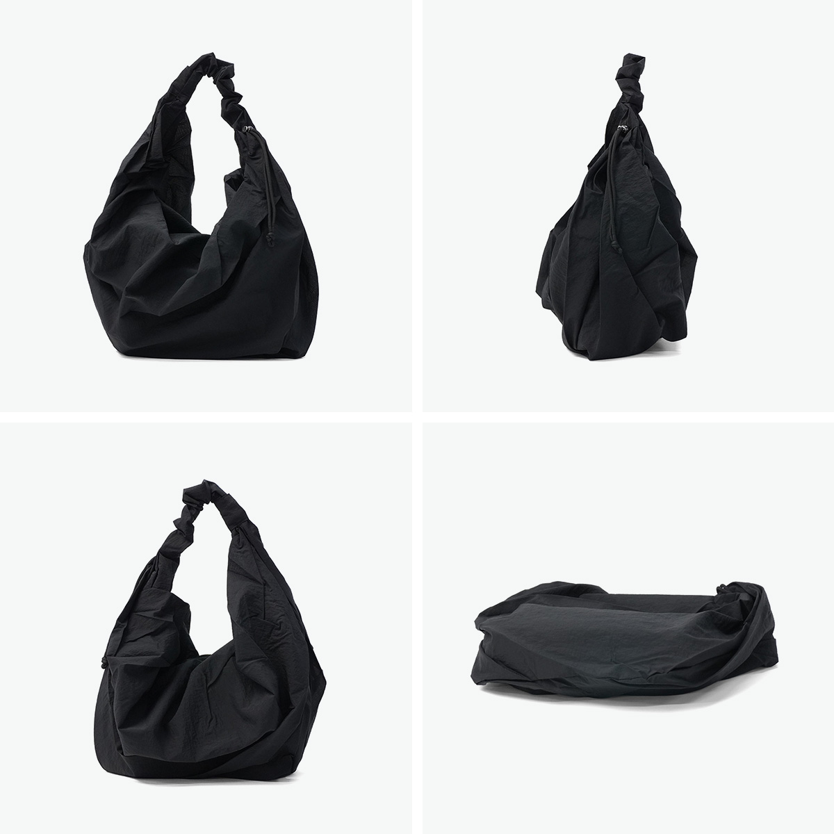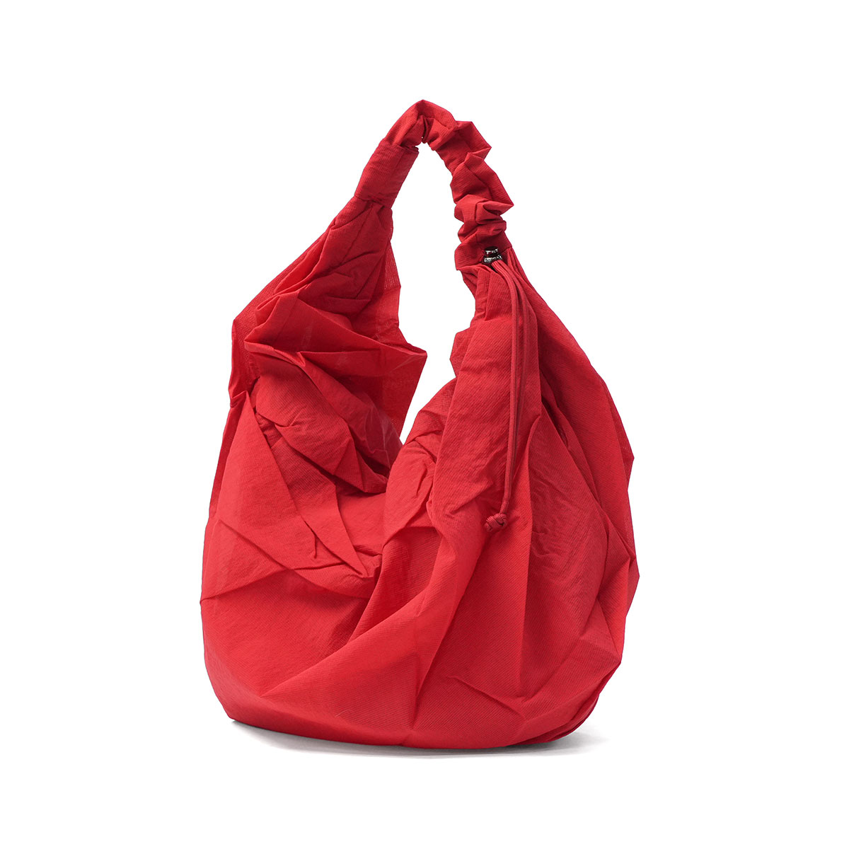 薄くて軽いリップストップ生地のドレーピングシルエットとツイストされたストラップがおしゃれなトートバッグ。ストラップのストリングをストッパーで調節し、ギャザーを寄せた可愛らしさも楽しめます。収納部はA4サイズ対応のたっぷりサイズ。裏地はしっかりした素材のナイロン製で、内部にもファスナーポケットを設けた、便利さとデザイン性を兼ね備えたバッグに仕上がっています。