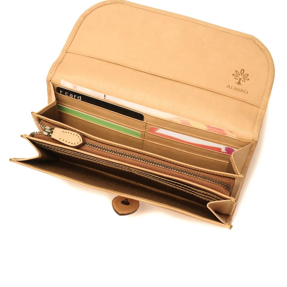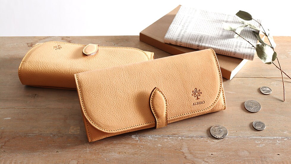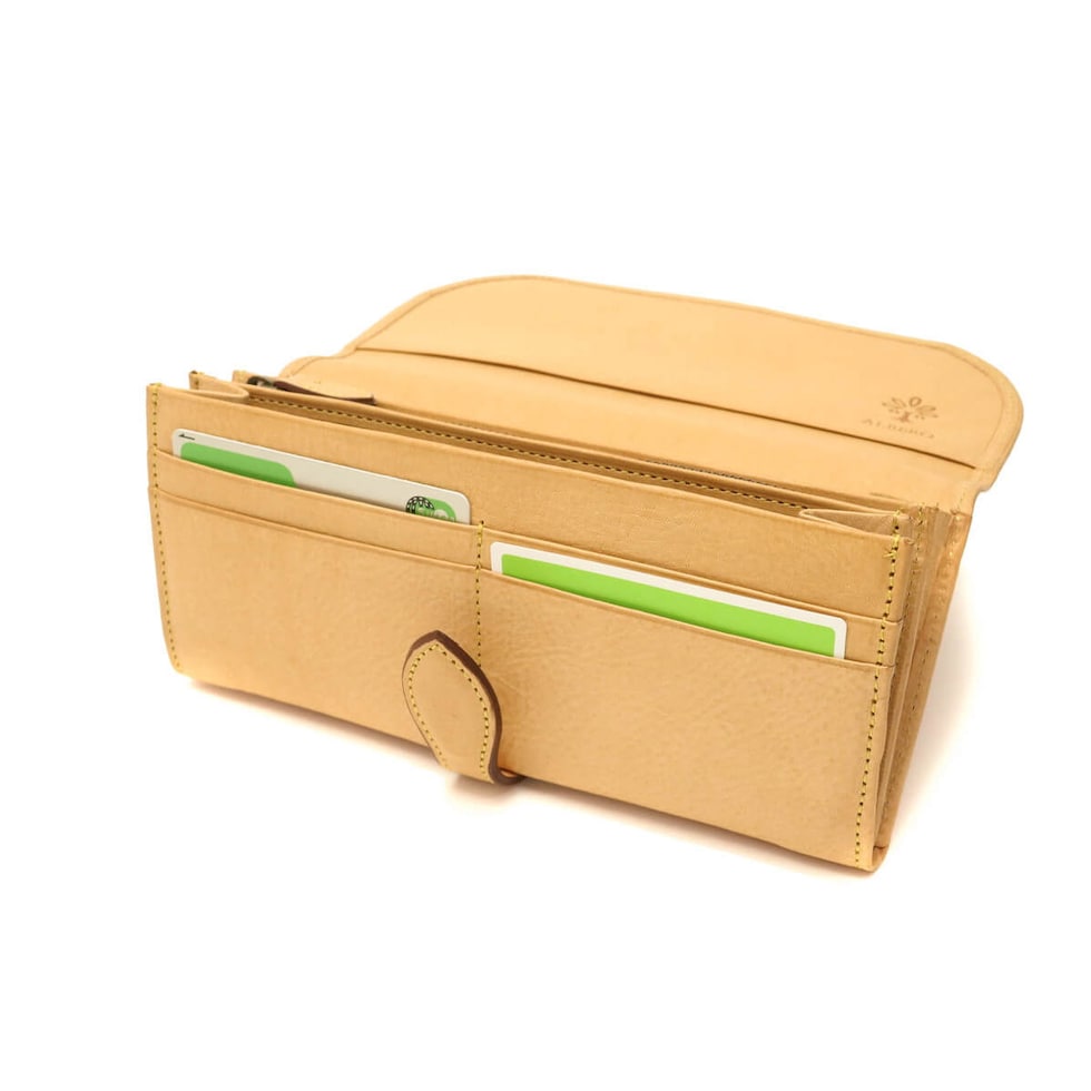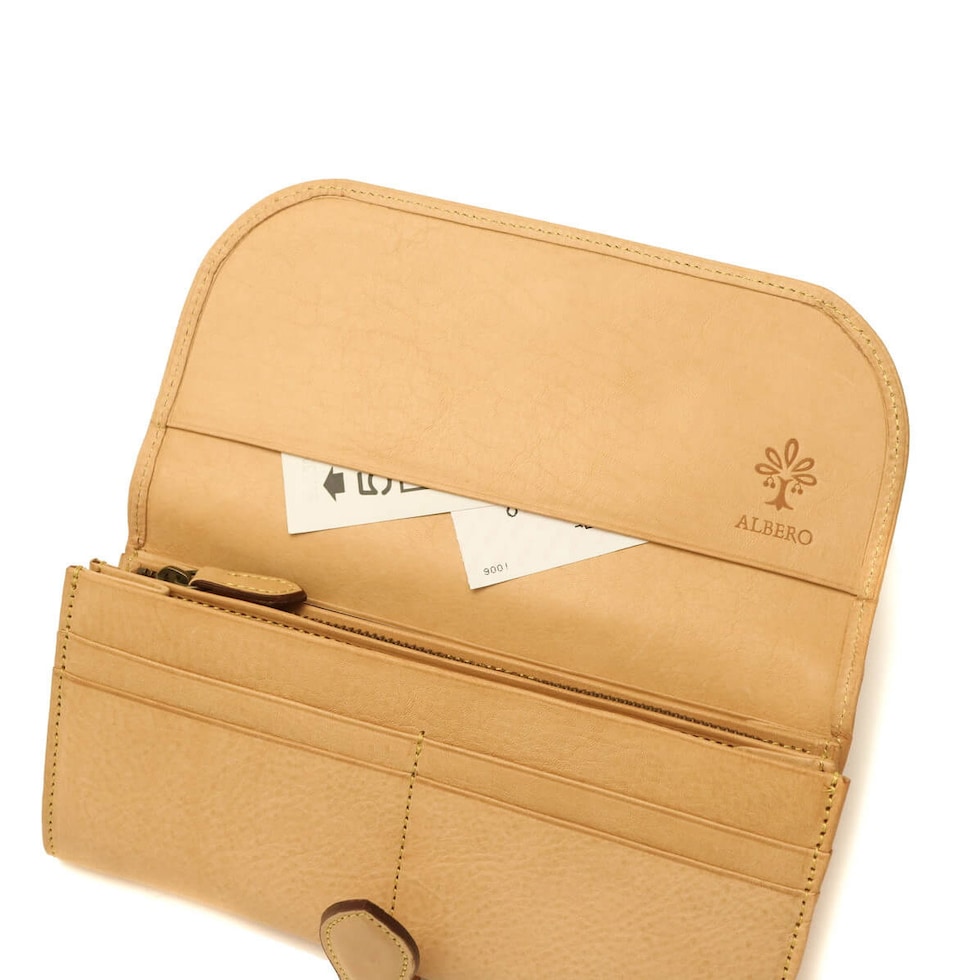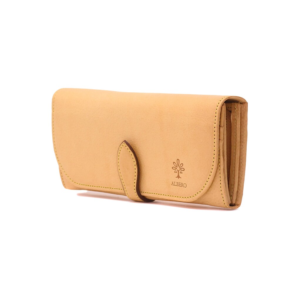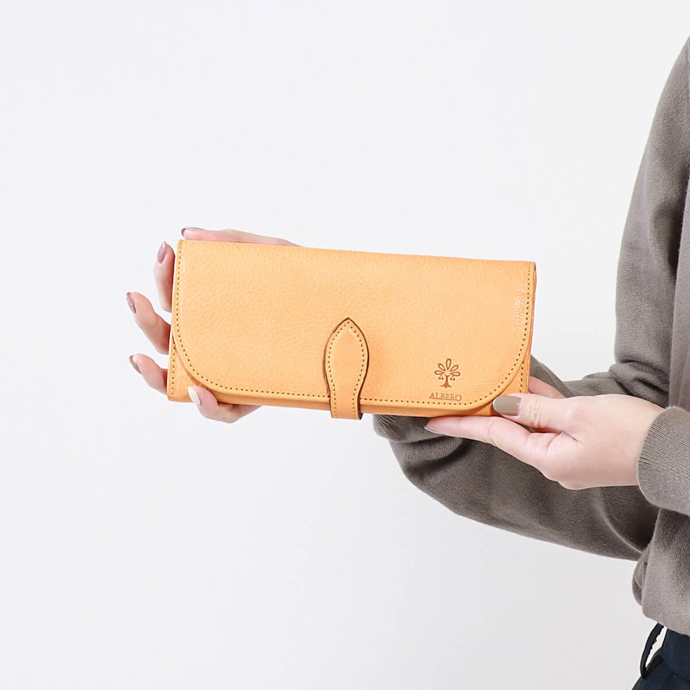 「自然を大切に」と思うデザイナーがイタリアや日本の職人と作り上げたALBERO。そのフィロソフィーを象徴する『NATURE/ナチュレ』シリーズの長財布です。フラップタイプで開けやすく、また、一見すっきりとした見た目でも十分な収納スペースが備わったアイテムとなっています。