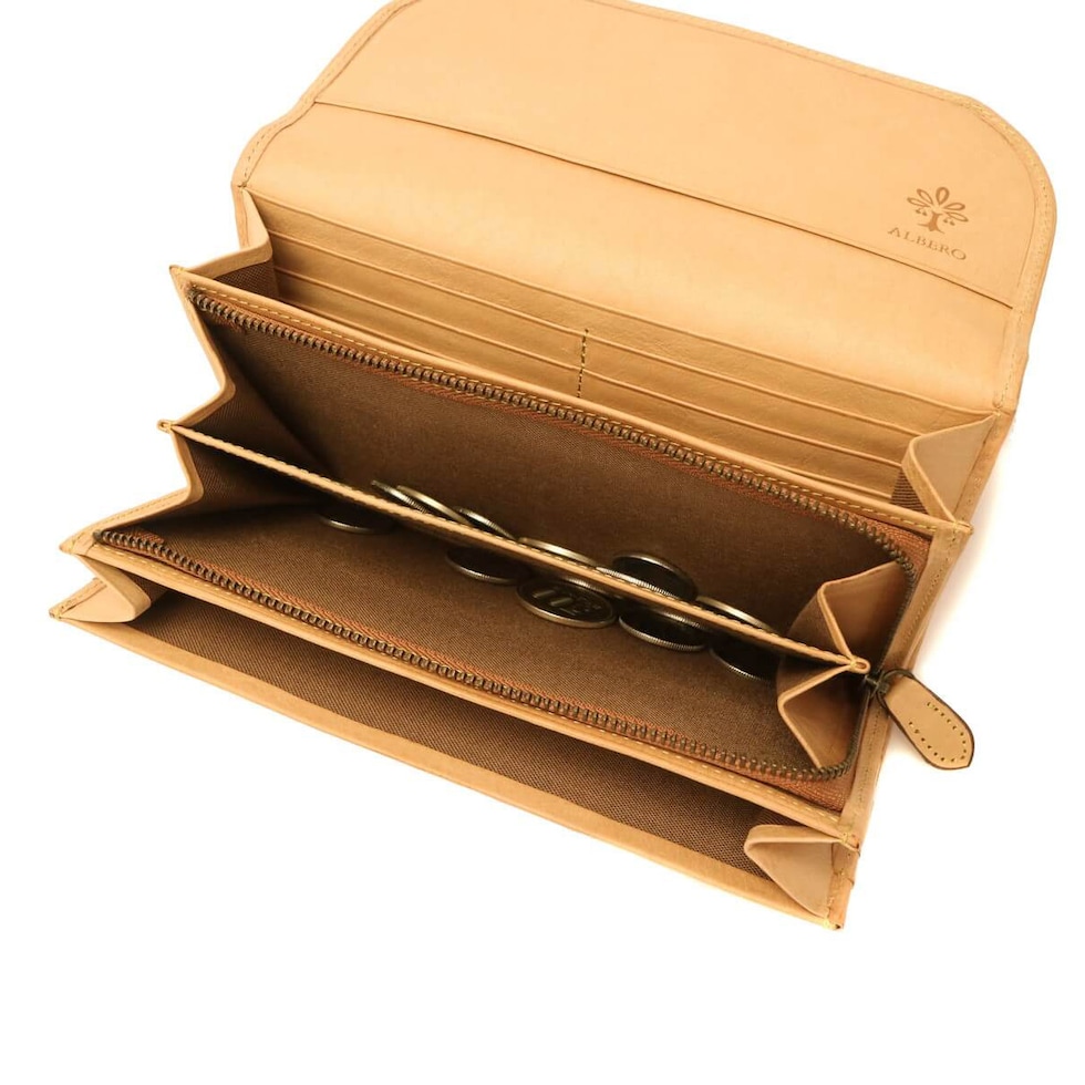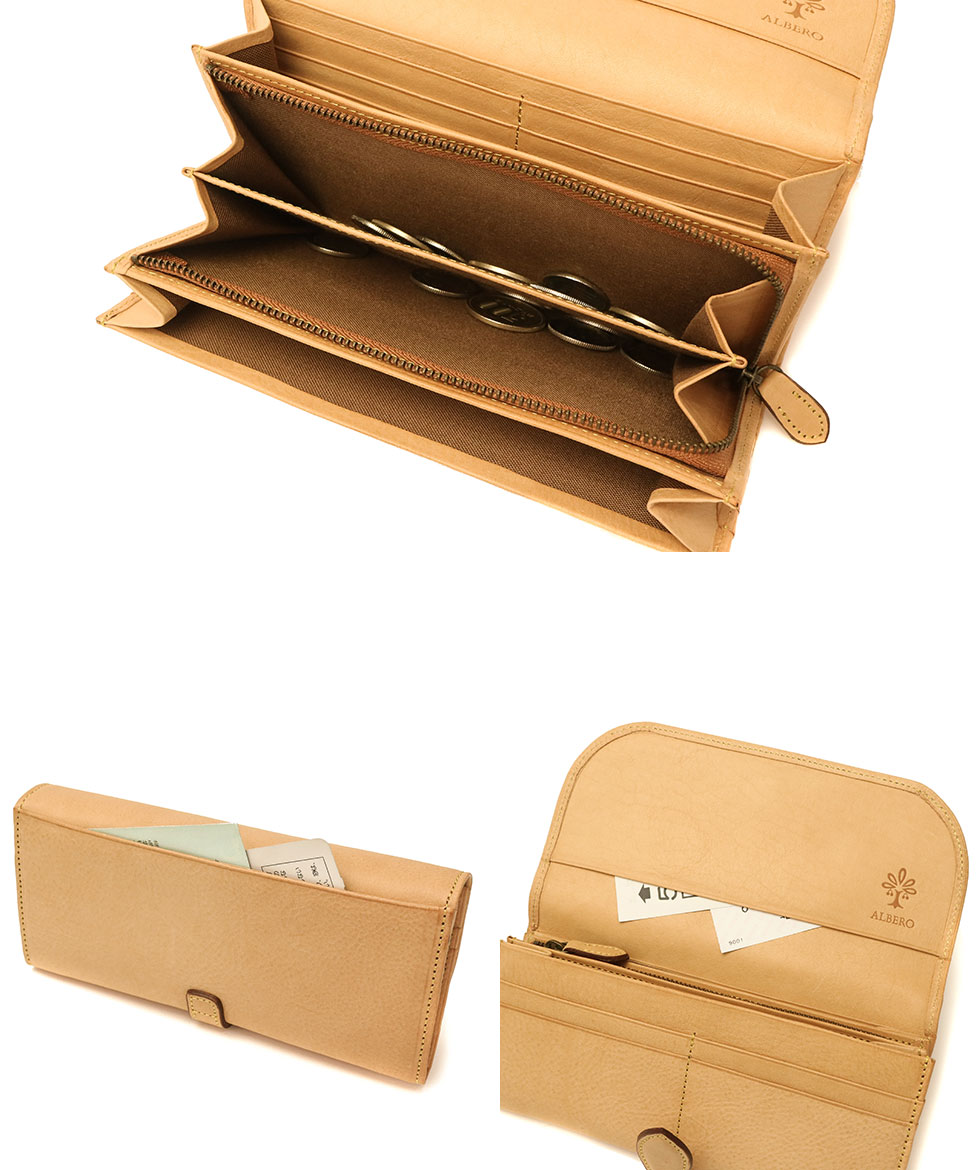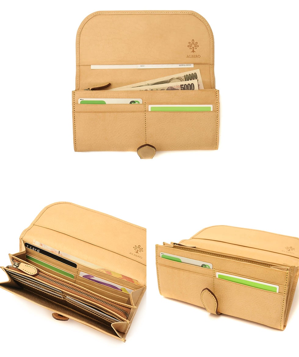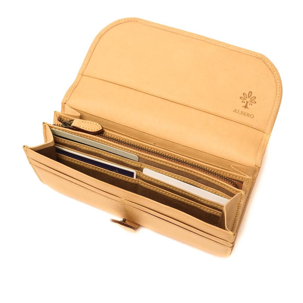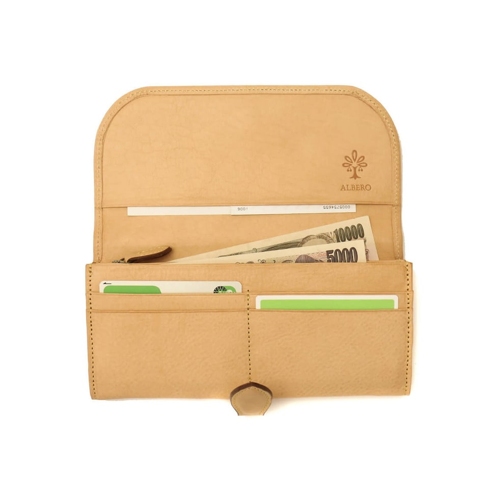「自然を大切に」と思うデザイナーがイタリアや日本の職人と作り上げたALBERO。そのフィロソフィーを象徴する『NATURE/ナチュレ』シリーズの長財布です。フラップタイプで開けやすく、また、一見すっきりとした見た目でも十分な収納スペースが備わったアイテムとなっています。