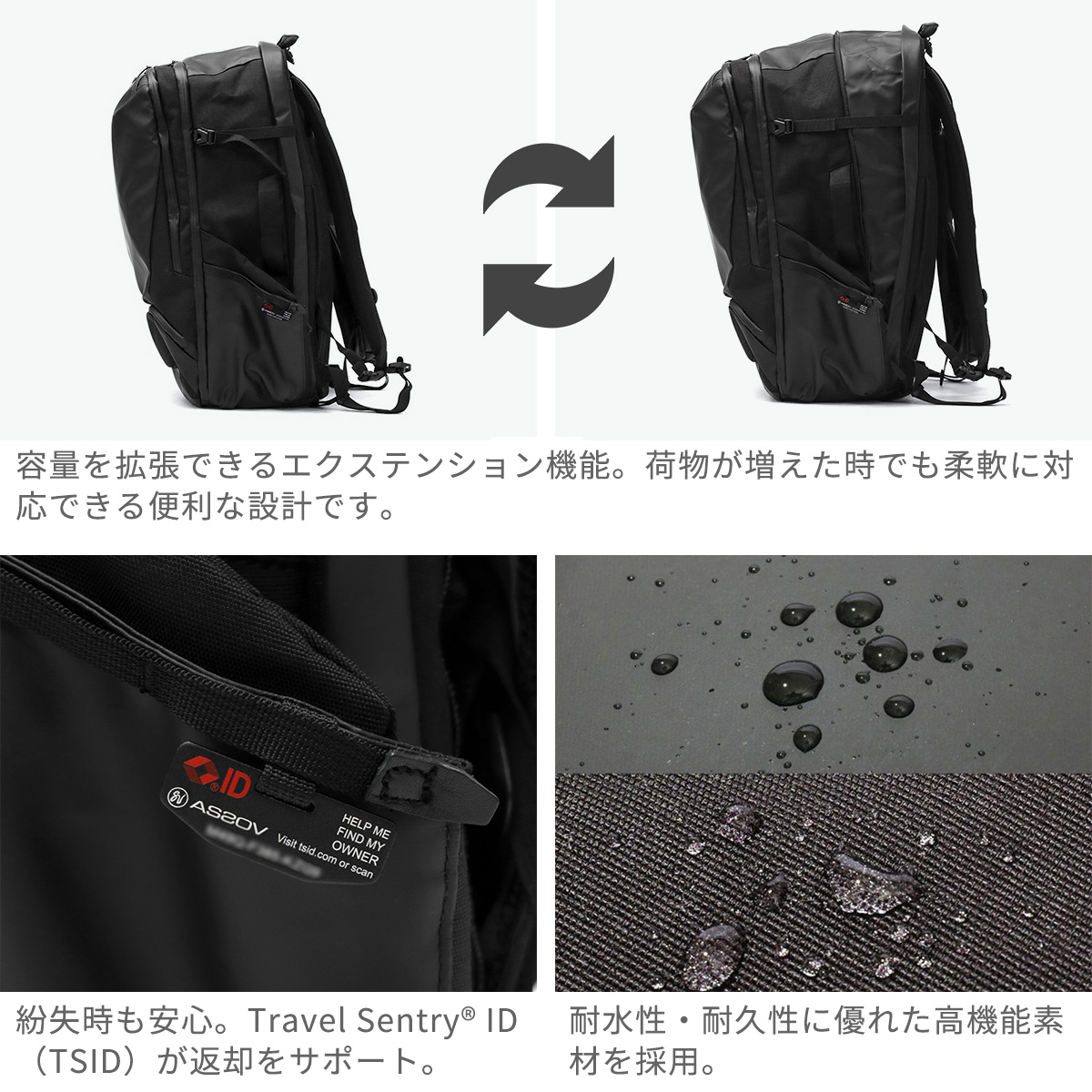 ビジネスとレジャーの両方に対応する「BLEISURE」シリーズの大型バックパック。出張や旅行など、仕事とプライベートをシームレスに繋ぐデザインです。軽量で耐久性・耐水性に優れたオリジナルファブリックを採用。PC・タブレット収納やガジェット整理ポケット、衣類用収納スペース、キャリーオン機能を備えた万能アイテムです。