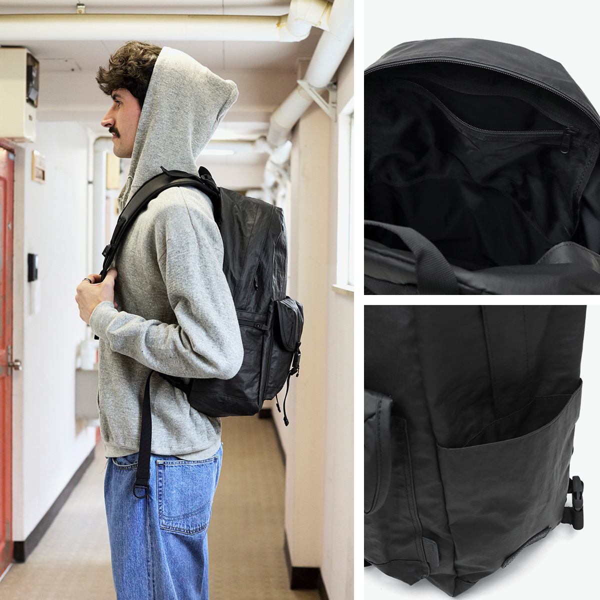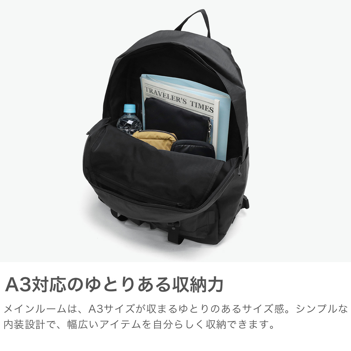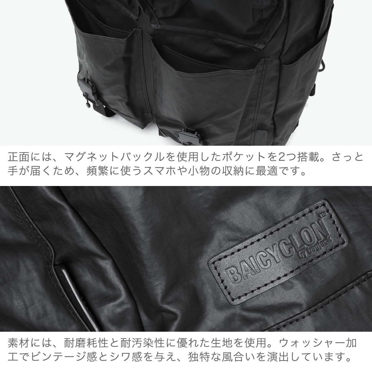 正面にマグネットバックル付きのポケットを備えたデイパック。表面に施したウォッシャー加工により、シワ感とビンテージ感を演出し、他にはない独自の風合いに仕上げました。さらに耐磨耗性と耐汚染性にも優れ、収納部はA3対応と、実用性も優れています。