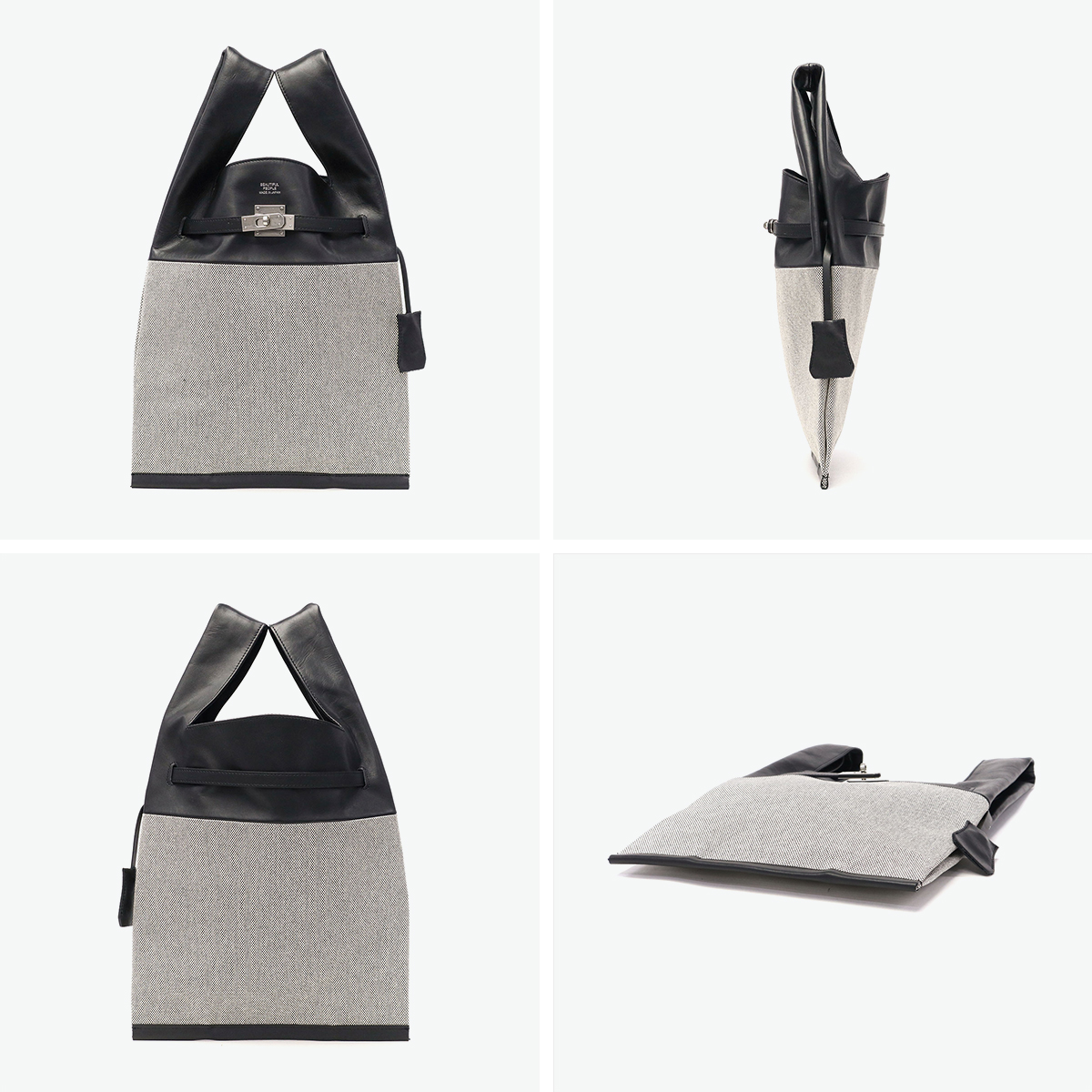 上質な牛革とカジュアルなコットンを組み合わせたトートバッグ。マーケットバッグと金具の組み合わせが特徴で、「高価」と「安価」、「理想」と「現実」など相反する要素を融合したデザインに仕上がっています。付属のチャームはキーリングとしても使用可能。裏地には手触りの良い起毛ポリエステルを採用し、使い心地も快適です。