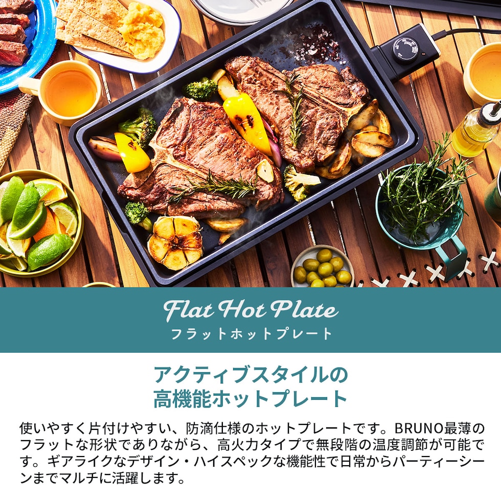 使いやすく片付けやすい、防滴仕様のホットプレートです。BRUNO最薄のフラットな形状でありながら、高火力タイプで無段階の温度調節が可能です。ギアライクなデザイン・ハイスペックな機能性で日常からパーティーシーンまでマルチに活躍します。