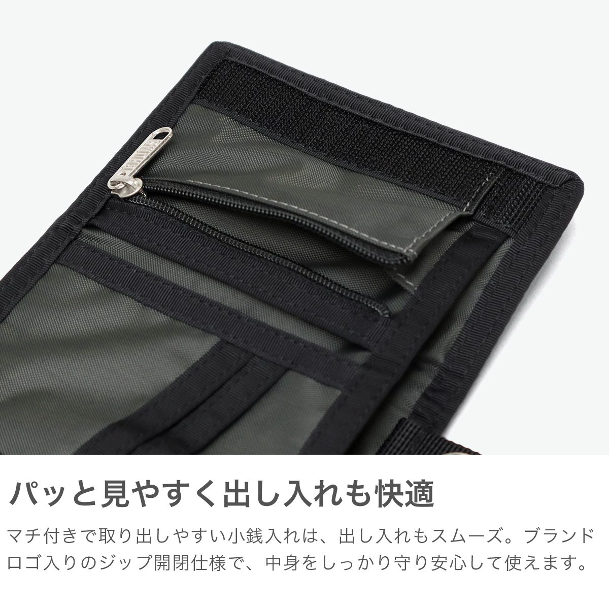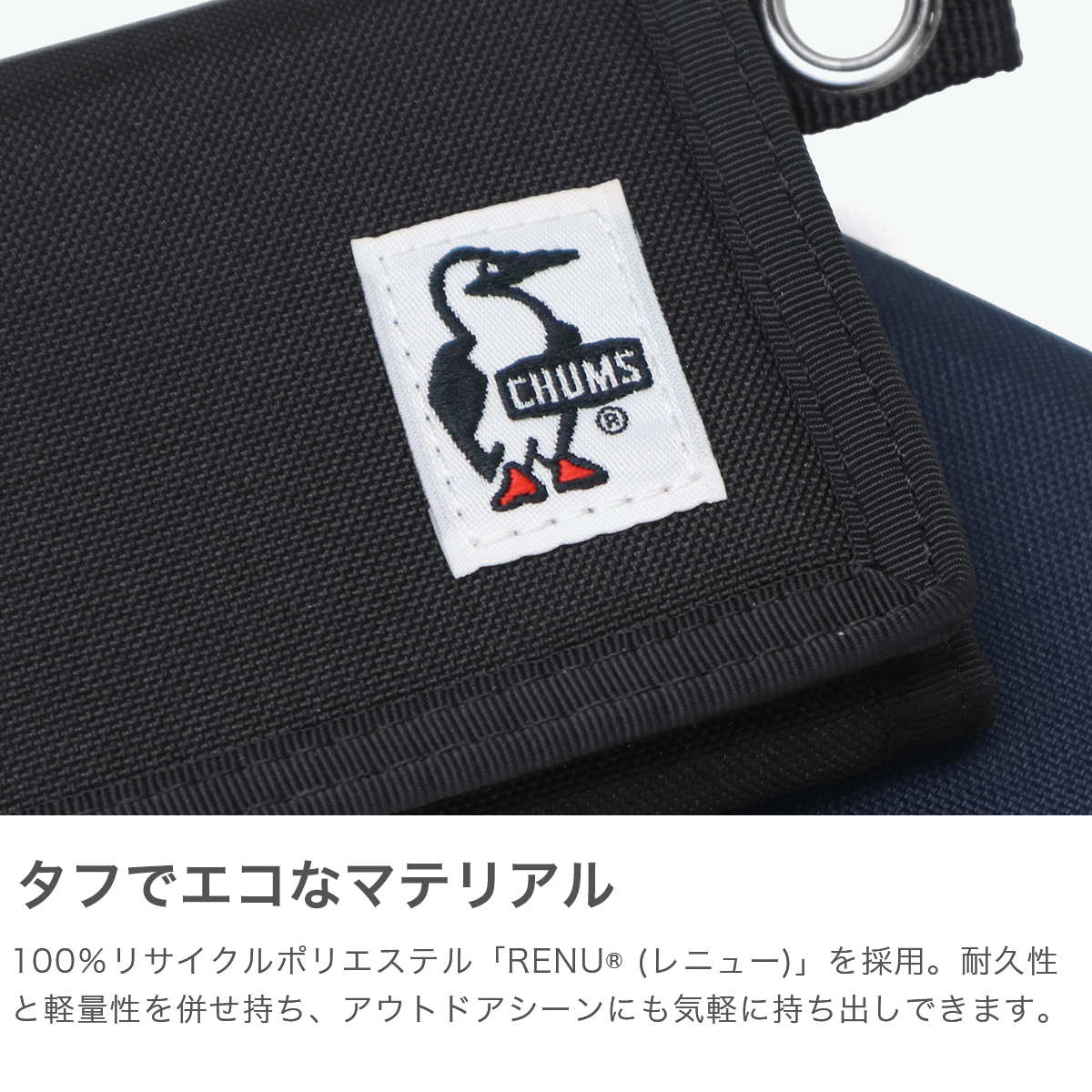 環境に配慮した100%リサイクルポリエステル素材「RENU (レニュー)」を採用した三つ折り財布。耐久性と軽量性を兼ね備え、アウトドアシーンにも気軽に持ち出せます。小さめバッグにも収まるコンパクトサイズ感もポイント。環境にも使い心地にも配慮した、毎日持ちたくなる仕上がりです。