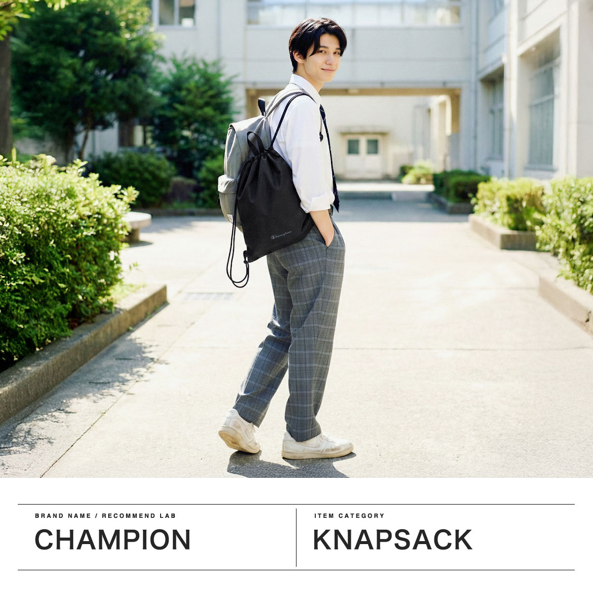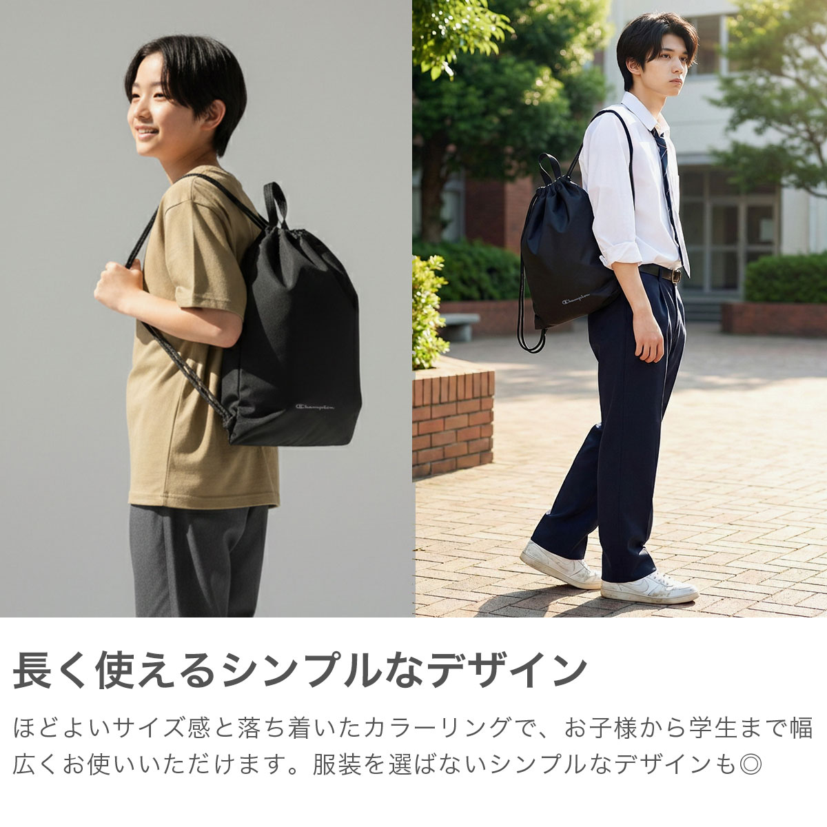 カジュアルシーンで人気のブランド『Champion/チャンピオン』のナップサック。体操着や着替えがすっきり入るA4対応サイズで、通学や部活、ジムやスポーツシーンでも活躍します。軽量で開閉しやすい巾着型に、手持ちできる短めのハンドル付き。制服にも私服にも合わせやすく、毎日のスクールシーンから普段使いまで幅広く活躍します。