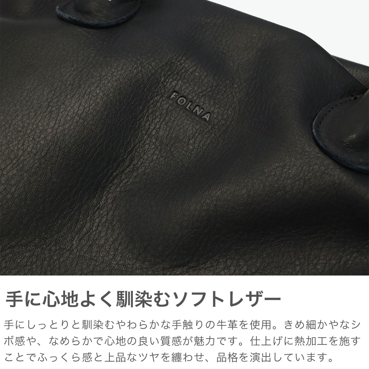 手にしっとりとなじむ柔らかな手触りの牛革を使用した「FOLNA RD」の人気シリーズ『SOFT LETHER』。余分な装飾をそぎ落としたデザインと、丸みを帯びたコロンとした柔らかいシルエット、袋縫いでふっくら仕上げた口元の立体感が上質な素材感を引き立て、シンプルながらも存在感のあるトートバッグです。デイリーだけでなくオケージョンスタイルでも活躍し、幅広いコーディネートにお使いいただけます。