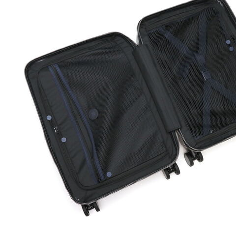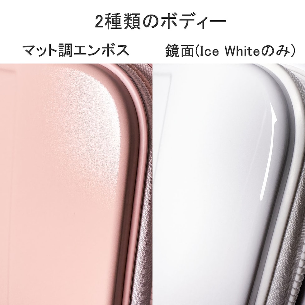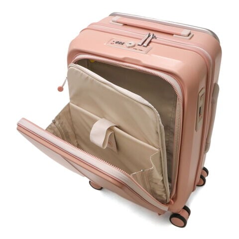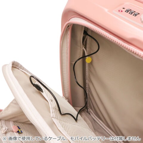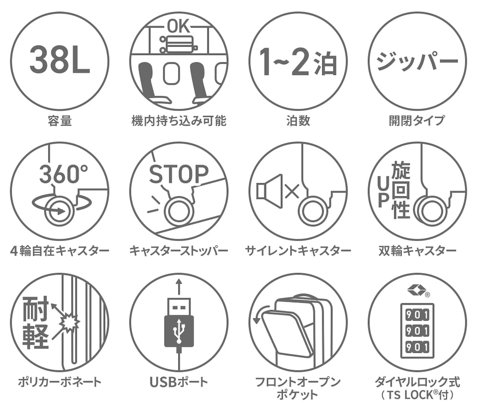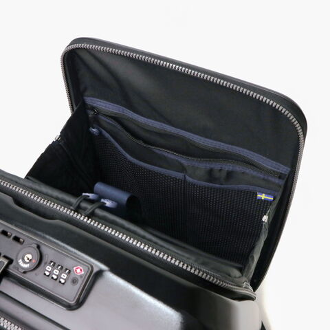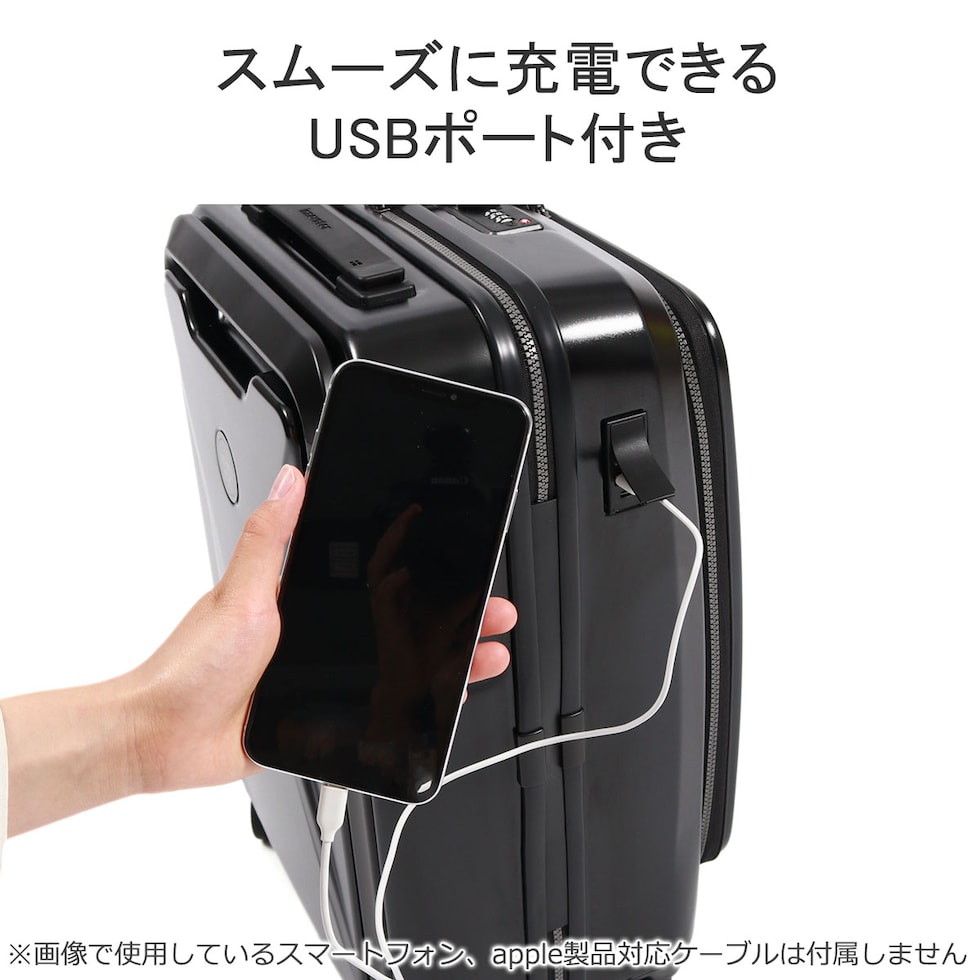 1~2泊の宿泊に最適で機内持ち込みも可能な、容量38Lのスーツケースです。素材には、耐衝撃性・耐熱性・耐燃性に優れたポリカーボネイトを使用。本体はアクセスに便利なフロントポケット付きで、内部にはPCやタブレットをしまっておけるクッション付きの専用スペースも設けています。また、本体のサイドにはUSBポートが付属しているので、モバイルバッテリーを接続すれば、移動中や待ち時間などに充電も行えます。