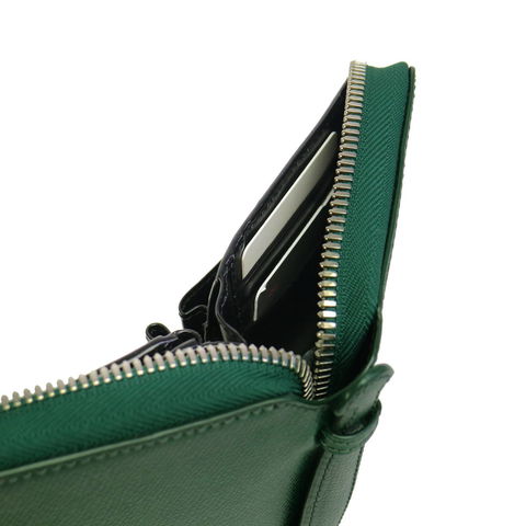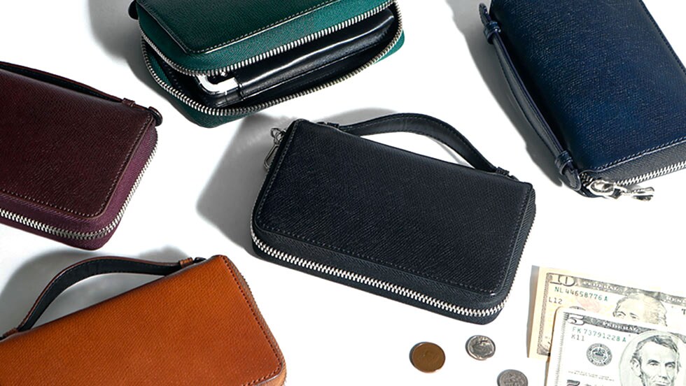 内装には、紙幣や小銭の収納スペースはもちろん、スマートフォンやパスポート、ペンなどの小物類もオールインワンで収納できるよう工夫された設計となっています。貴重品が一つにまとまりますので、外出の効率がグッと上がるはず。ハンドルに手を通し、小さなクラッチバッグのようにサッと持ち歩けます。