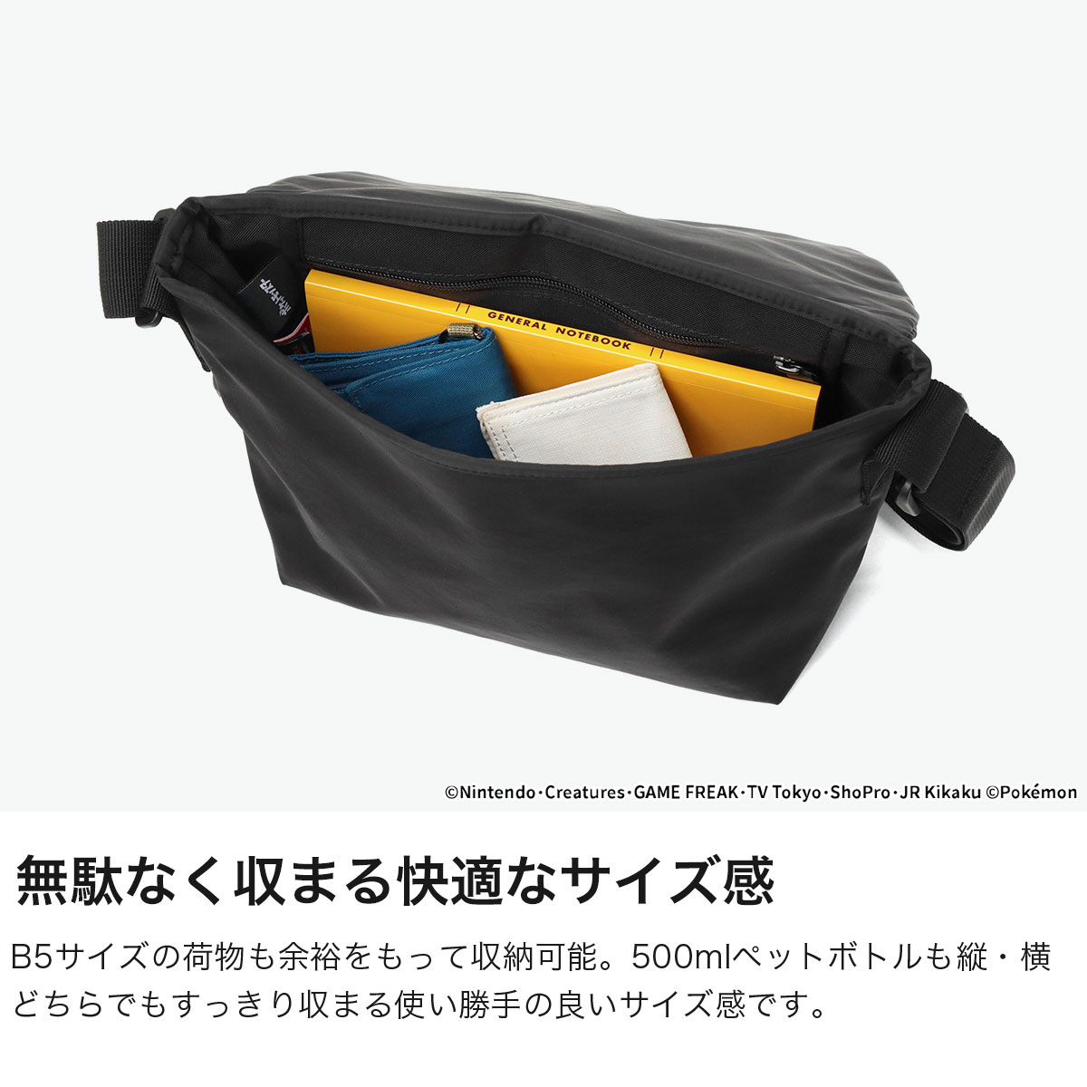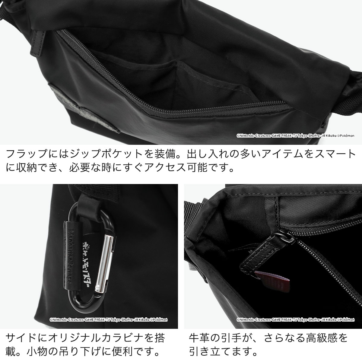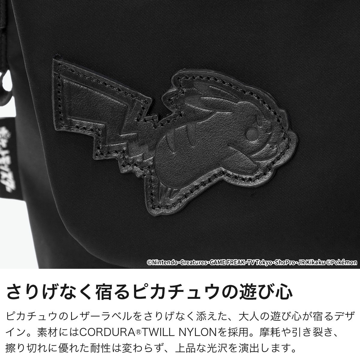 世界中で愛される「ポケットモンスター(ポケモン)」デザインのコレクションから登場したメッセンジャーバッグ。日常使いしやすいコンパクトなサイズ感が魅力です。ピカチュウをあしらったレザーラベルがさりげないアクセントに。メイン素材にはCORDURA TWILL NYLONを使用し、プーラーには牛革を採用することで、耐久性と高級感を兼備。カラビナやジップポケットも備え、機能性にも優れた特別仕様のアイテムです。