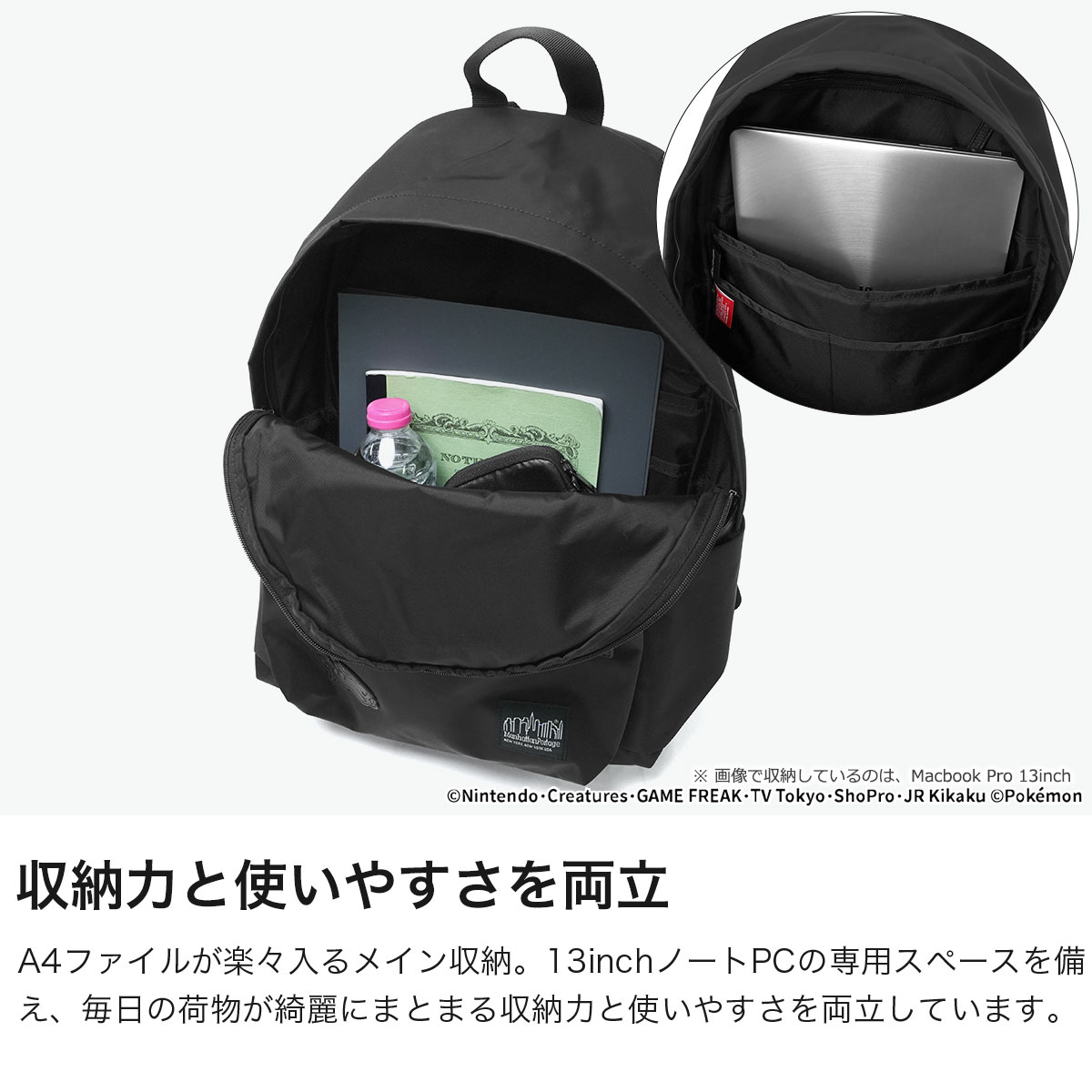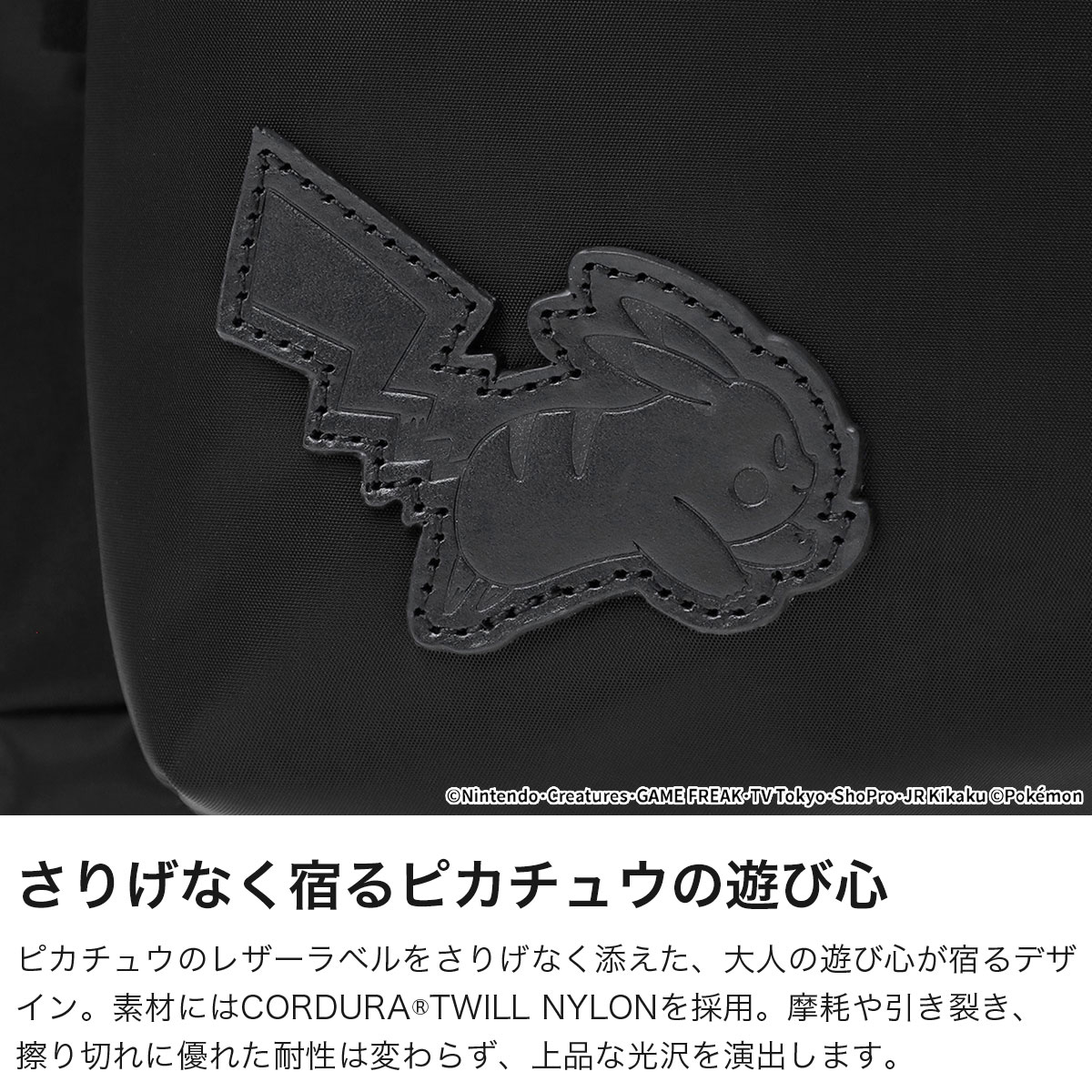 世界中で愛される「ポケットモンスター(ポケモン)」デザインのコレクションから登場したバックパック。A4サイズやPCも収納可能な22L容量で、日常使いに最適です。ピカチュウのレザーラベルがさりげないアクセントに。耐久性に優れたCORDURA TWILLナイロンと牛革プーラーを採用し、高級感も兼備。機能性抜群の特別仕様アイテムです。