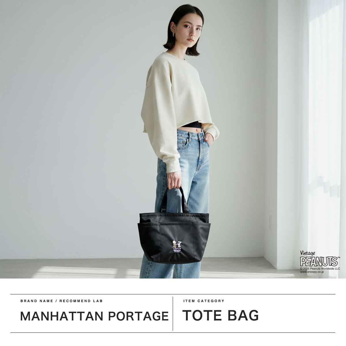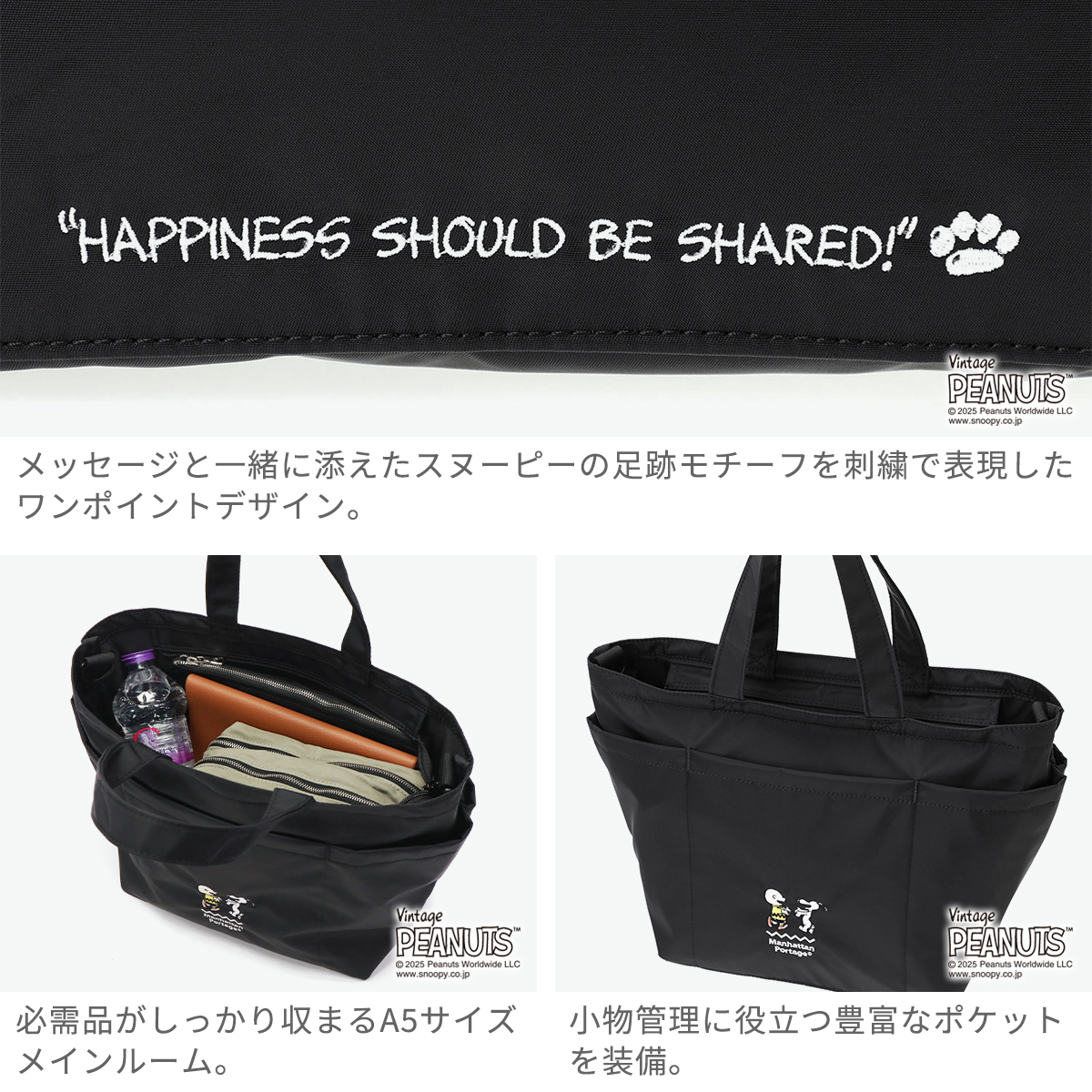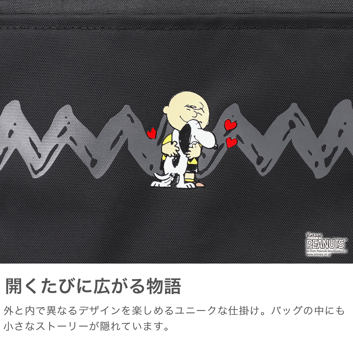 多くの人々を魅了し続ける『PEANUTS』とのコラボレーションコレクションから、2WAYトートが登場。今作はチャーリー・ブラウンとスヌーピーの2ショットをメインアートに採用し、外側と内側のデザインでストーリーが展開される、クリエイティブな仕上がりとなっています。さらに、チャーリー・ブラウンを象徴する「ジグザグ模様」や、コミック内のセリフの刺繍など、遊び心あるディティールもポイントです。