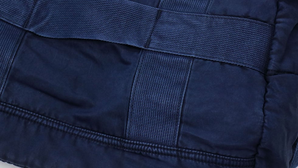 フライトジャケットに使われるナイロン糸で生地を織り、手間暇のかかる後染めによって染色。独特な味わいを醸し出し、デニムのような色ムラやパッカリングが現す、ユーズド感のある表情が魅力です。色落ちによる経年変化を楽しめるのも特徴的。また、加工の施されたパーツにもデザイン性の高さが現れています。