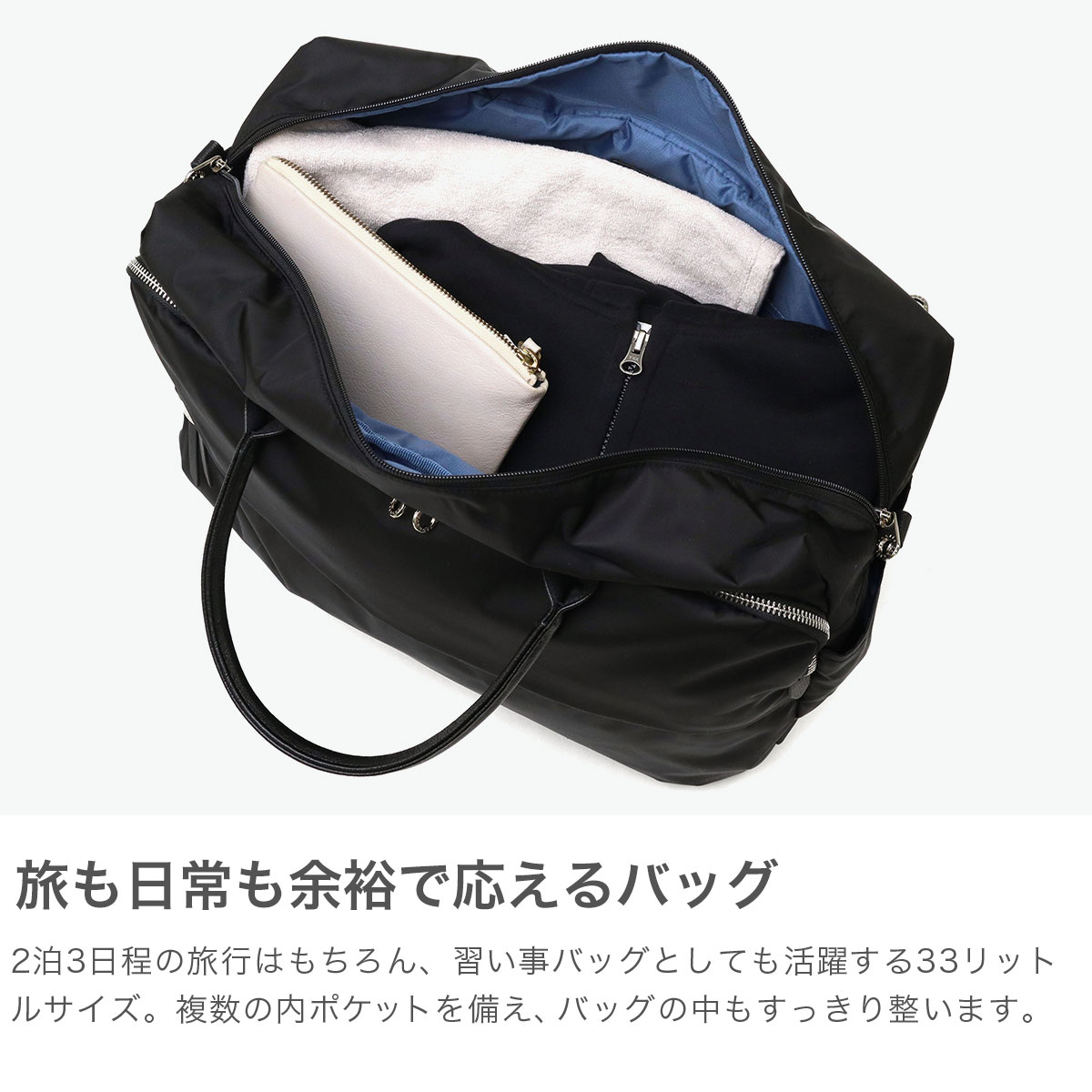 シンプルで使いやすさにこだわったバッグシリーズ『サージュ』から2WAYボストンバッグが登場。33Lの程よい容量にキャリーオン機能を備え、旅行や出張に最適です。A4・B4対応で、ショルダー付きの2WAY仕様が通勤にも活躍。きれいめデザインが大人の女性に馴染む、上品で実用的な一品です。