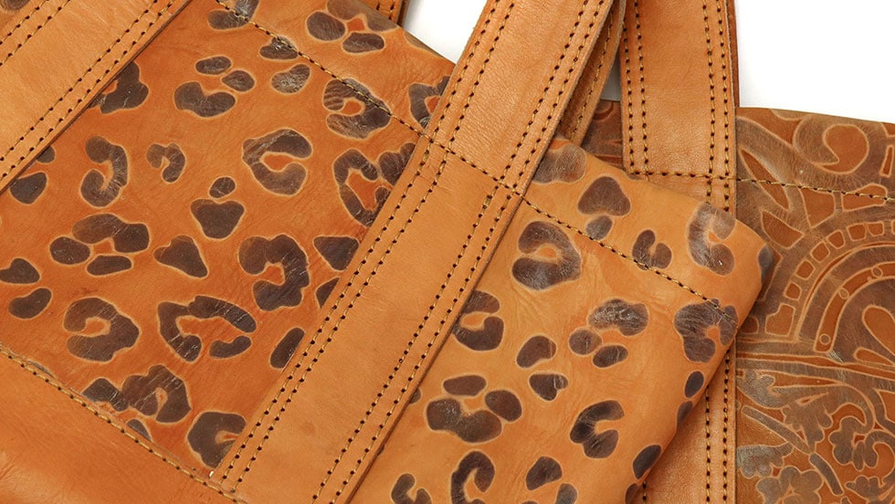 インドネシアで古くから受け継がれるバティック(ろうけつ染)の技術を応用。プリントとは違い、熱した銅の型にロウを乗せヌメ革に柄を焼き付けているのが特徴です。革の厚みや微妙な温度の違いにより焼き色が異なるので一つとして同じものはなく、革に残ったロウにより経年変化を楽しめるのも魅力です。