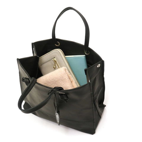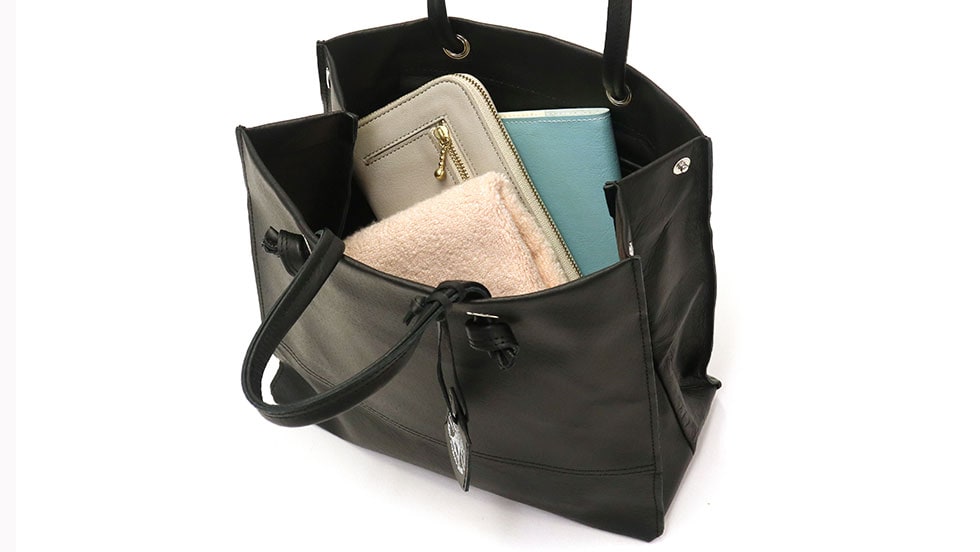 収納部は、財布やタオル、スマートフォンなど、お出掛けに必要な小物類の収納にぴったり。横マチの上方にはホックがついており、荷物の量に合わせてボリューム感を調節することができます。また、内側にはポケットを2ヶ所設けているため、細々としたアイテムの整理もばっちりです。
