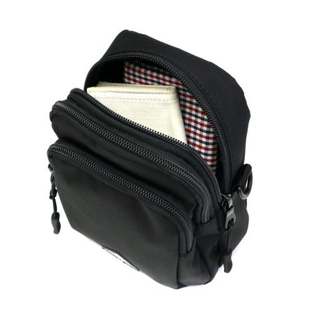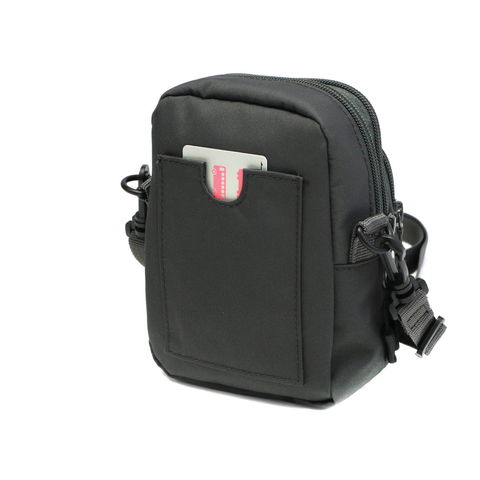2ルームタイプのメイン収納部は、折り財布やスマホなどの最低限必要なものだけがすっきり収まるサイズ感。正面に小物類がしまえるジップポケット、背面にはチケットやICカードなどの収納に役立つポケットを備え、シンプルかつ使いやすいデザインとなっています。