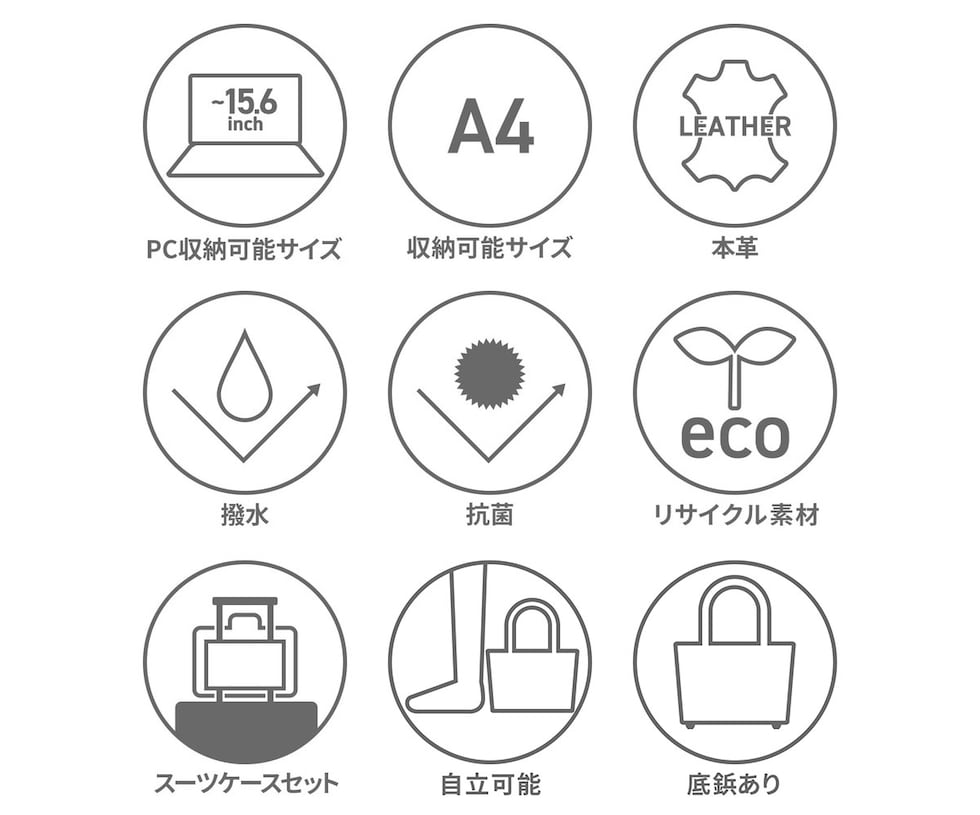 詳細説明 フロントのオープンポケットやPC収納、小物の収納に役立つメッシュポケット等を装備。抗菌加工を施した内装には、回収したペットボトルを100%原料とする素材を採用。環境に配慮しつつ、衛生的な使い心地を実現しています。またキズや汚れなどのダメージも軽減してくれる底鋲を搭載した仕様もポイントです。