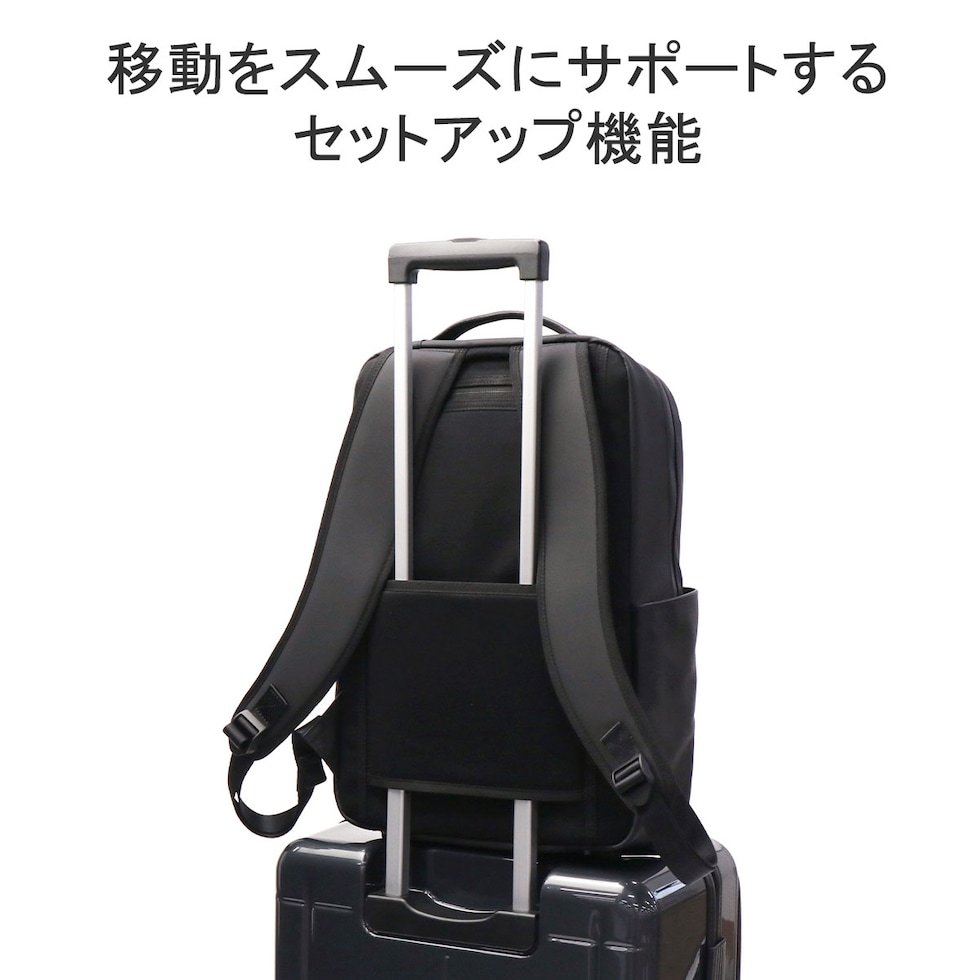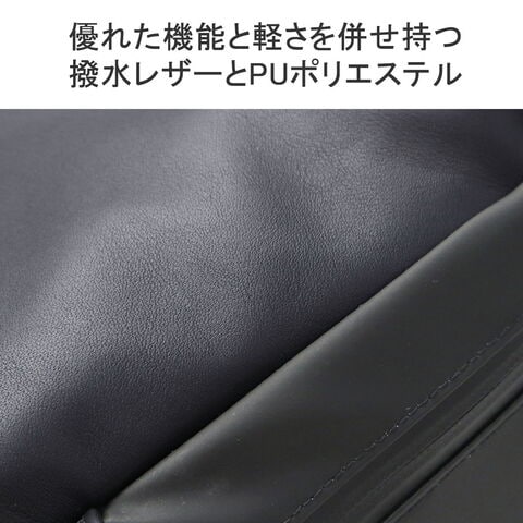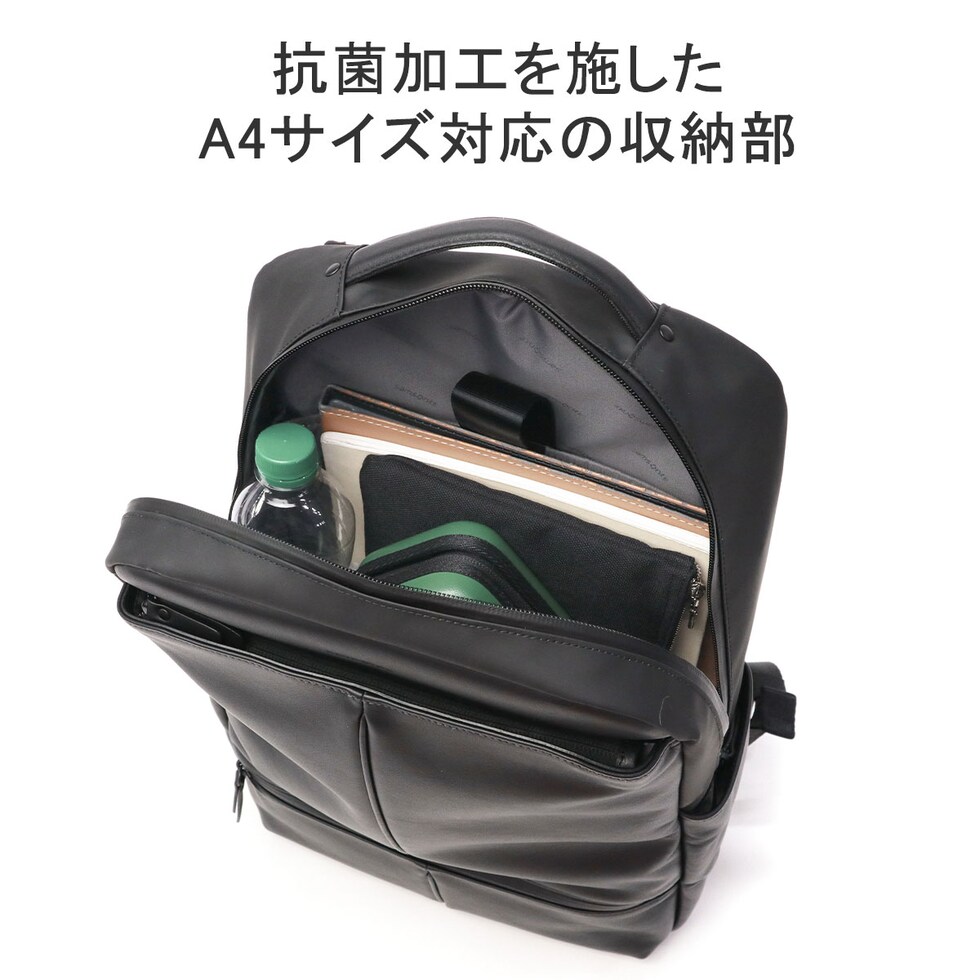 フロントのオープンポケットやPC収納、小物の収納に役立つメッシュポケット等を装備。抗菌加工を施した内装には、回収したペットボトルを100%原料とする素材を採用。環境に配慮しつつ、衛生的な使い心地を実現しています。またキズや汚れなどのダメージも軽減してくれる底鋲を搭載した仕様もポイントです。