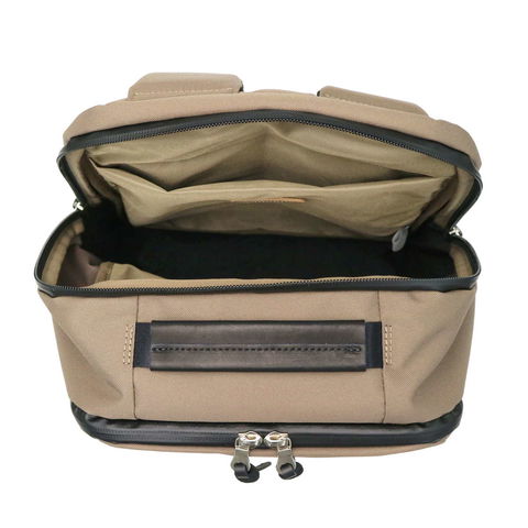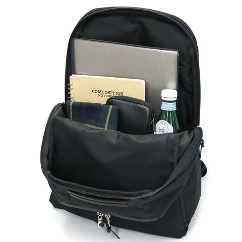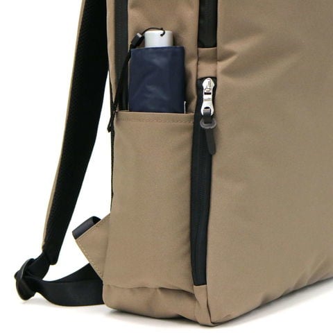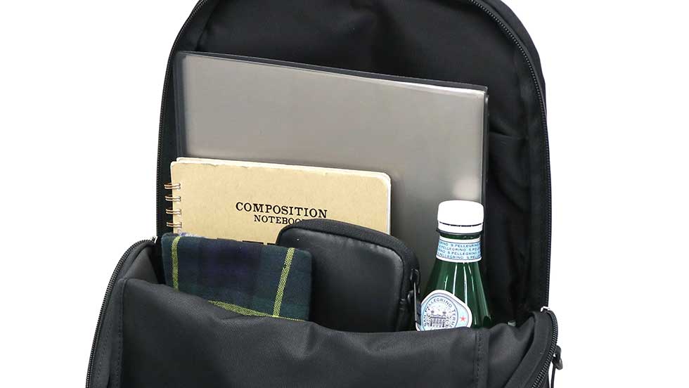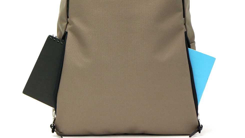 本体はA4サイズ対応の丁度良いサイジング。13インチ程度のPCが収まるスペースを備え、またマチも広く取っているので、毎日の通勤に必要なアイテムがまとまります。収納口には止水ファスナーを使用しており、雨天時に中の荷物が濡れることを防ぎます。