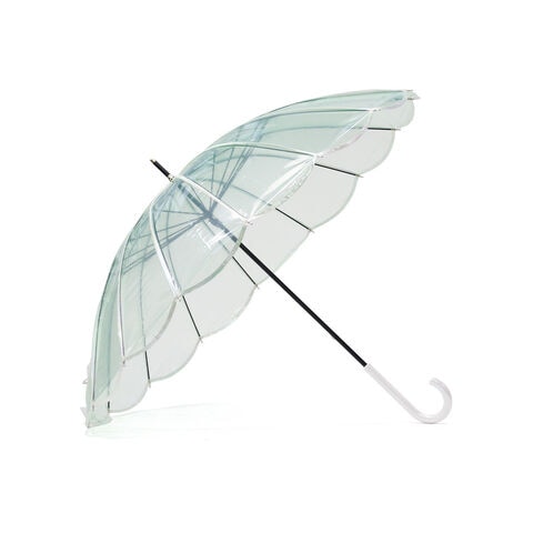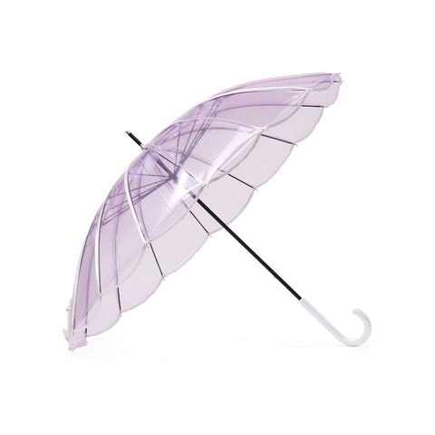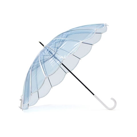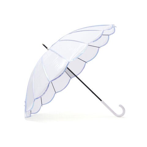 マーメイドが纏う貝殻をイメージとした美しい雨傘。水面の輝きを連想するキラキラとしたパイピング、パールのような輝きの手元とパールボタンが、幻想的な雰囲気を演出します。16本の多骨が、美しいフォルムと優れた耐風性を実現。長く愛用できる、使い捨てにしないビニール傘です。