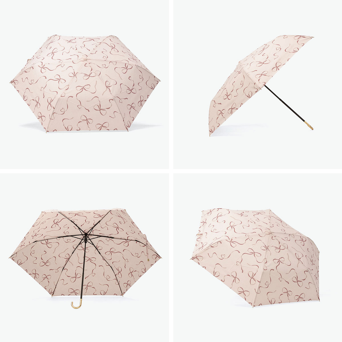 上品なリボン柄の中にハートモチーフを忍ばせた、大人フェミニンなデザインの折りたたみ傘。ゴールドの持ち手とパールボタンがアクセントになり、甘さをほどよく抑えた上品な仕上がりになっています。晴雨兼用でUVカット機能も備えているため、雨の日はもちろん、日差しが気になる日にも活躍するアイテムです。