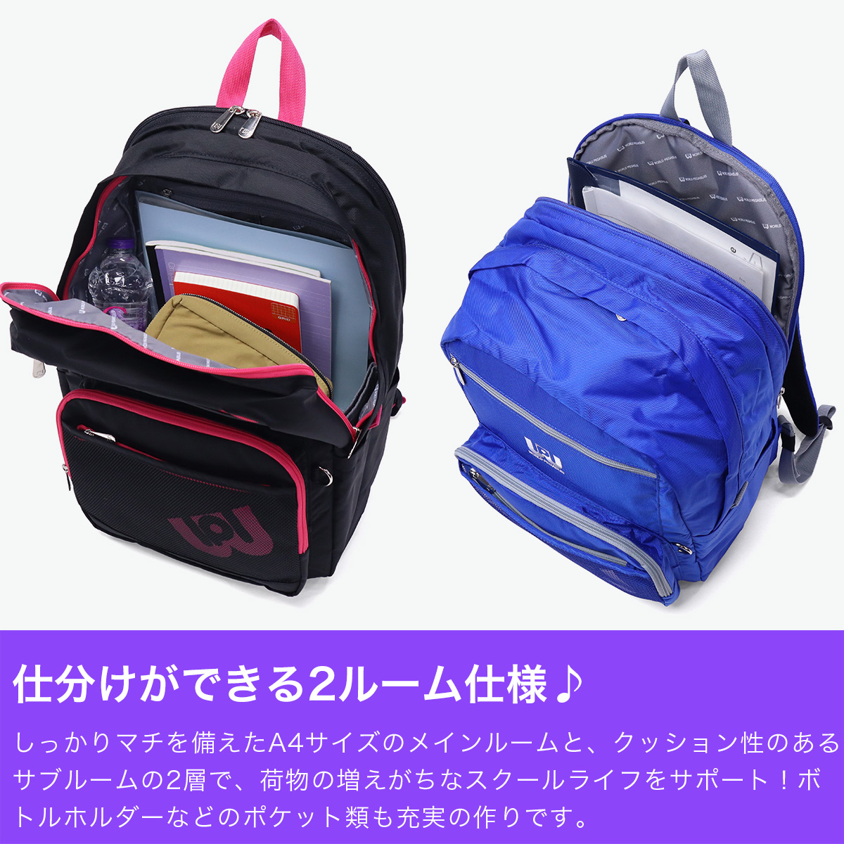 JKモデルたちと作り上げた、毎日を元気に、カラフルに彩るリュックが登場!背負った時のシルエットはかわいさをキープしつつ、2層タイプで荷物はたっぷり収納可能な作り。撥水生地のポケットなど、あったら嬉しい機能も充実♪豊富なカラーバリエーションで、友達とおそろいも楽しめて写真にも映えるデザイン。スクールライフをもっと楽しくする工夫にあふれたアイテムです!