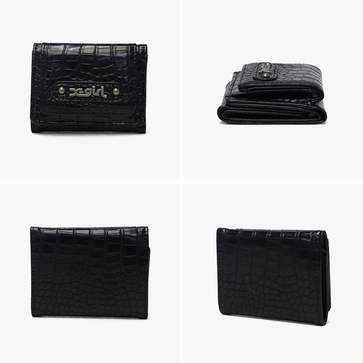 「X-girl」のロゴメタルネームと高級感漂うフェイククロコ素材が特徴の三つ折り財布。人気のミニバッグにも収納しやすい、持ち歩きに便利なコンパクトサイズ。コンパクトながらも札入れや小銭入れが完備され、使いやすいデザイン。自分用にはもちろん、プレゼントにもぴったりなアイテムです。