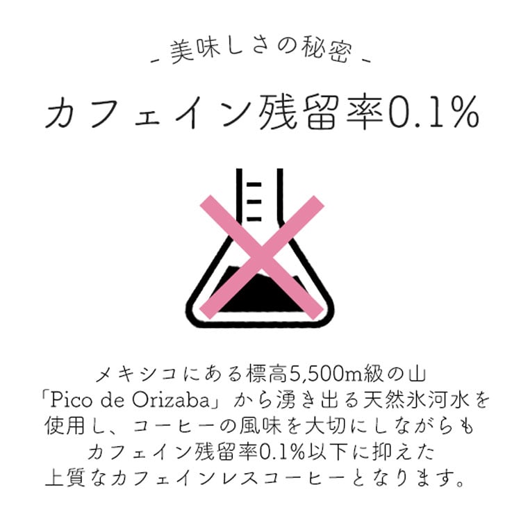 メキシコにある標高5,500m級の山「Pico de Orizaba」から湧き出る天然水を使用し、コーヒーの風味を大切にしながらもカフェイン残留率0.1%以下に抑えた上質なカフェインレスコーヒーとなります。