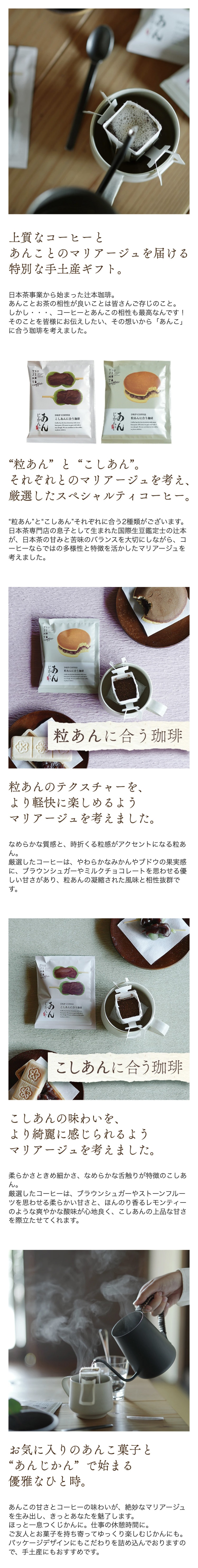 日本茶専門店の息子として生まれた国際生豆鑑定士の辻本が、コーヒーならではの多様性と特徴を活かした、あんことのマリアージュを考えました。 2種それぞれのコーヒーとあんこのマリアージュをお楽しみください。 ちょっとした手土産や、プレゼントに。ご自身へのご褒美にもおすすめです。