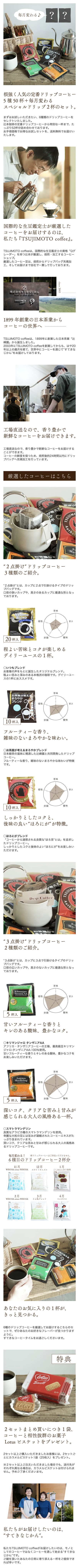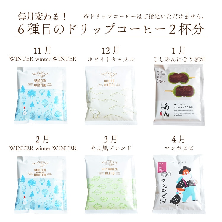 辻本珈琲の定番ドリップコーヒー5種50杯と、毎月変わるスペシャルドリップコーヒー2杯をセットにした、6種52杯分を送料無料にてお届けいたします。リーズナブルな価格で、毎日のコーヒータイムにおススメです。