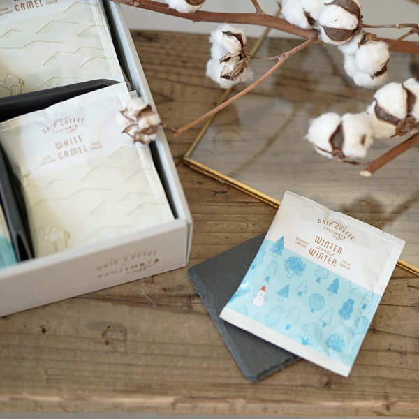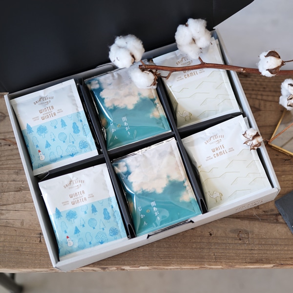 当商品はそんな想いを形にしたドリップコーヒー「雨あがりのじかん」と冬の季節限定商品「WINTER winter WINTER」、イエメンのスペシャルティコーヒー「ホワイトキャメル」をセットにした冬季限定ギフト商品となります。