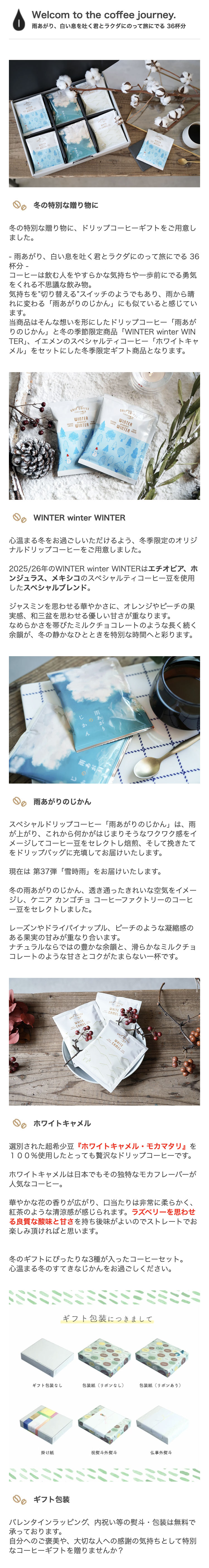 冬の特別な贈り物に、ドリップコーヒーギフトをご用意しました。 コーヒーは飲む人をやすらかな気持ちや一歩前にでる勇気をくれる不思議な飲み物。 気持ちを”切り替える”スイッチのようでもあり、雨から晴れに変わる「雨あがりのじかん」にも似ていると感じています。 当商品はそんな想いを形にしたドリップコーヒー「雨あがりのじかん」と冬の季節限定商品「WINTER winter WINTER」、イエメンのスペシャルティコーヒー「ホワイトキャメル」をセットにした冬季限定ギフト商品となります。
