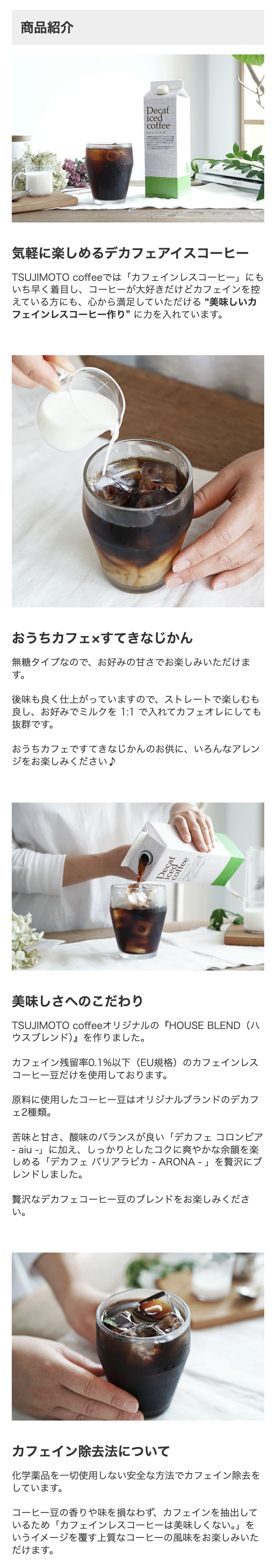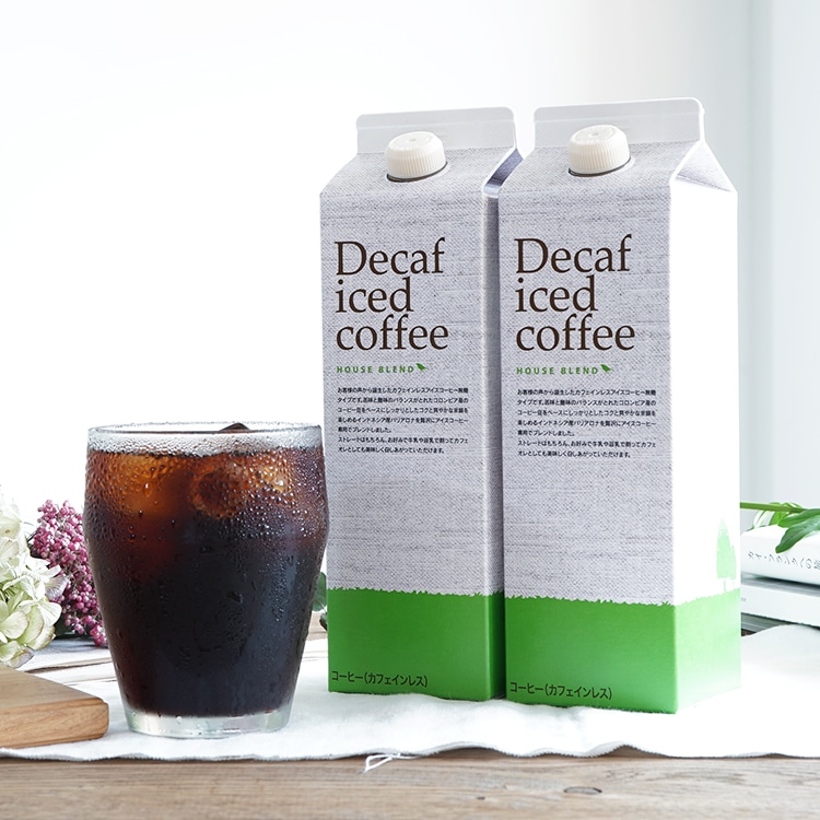 カフェインレスコーヒーを使用した深みのあるオリジナルブレンド。 カフェインレスでもしっかりとしたアイスコーヒーの風味をお楽しみ頂くために専用の『HOUSE BLEND(ハウスブレンド)』を作りました。 妊産婦さんやカフェインの摂取を控えている方にもお楽しみ頂けるようカフェイン残留率0.1%以下(EU規格)のカフェインレスコーヒー豆だけを使用しています。 原料に使用したコーヒー豆は辻本珈琲オリジナルデカフェの2種類。苦味と甘さ、酸味のバランスが良いデカフェ・コロンビア-アイウ-に加え、しっかりとしたコクに爽やかな余韻を楽しめるのバリアラビカ -アロナ-を贅沢にブレンドしました。 ストレートで楽しむも良し、お好みでミルクを入れてカフェオレにしても抜群です。